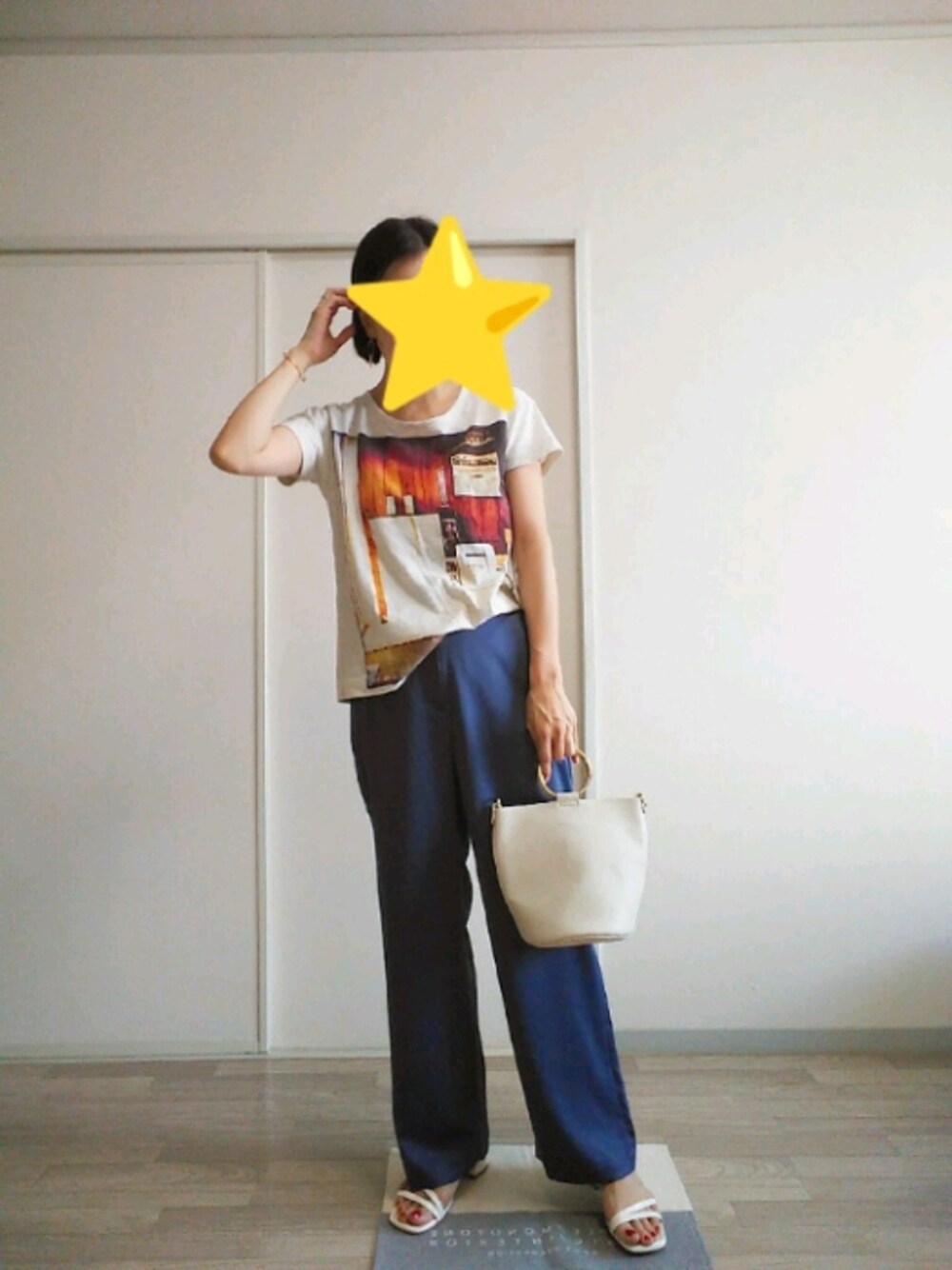 フォトT着回し。 Tシャツにかなりインパクトがあって、カジュアルなので、他のアイテムはきれいな感じにしたかった。 なのでボトムスはサテン。 サンダルはヒールのあるもの。 バッグはゴールドのハンドルに。 Tシャツを片方だけインしたかったのに ただのだらしない人になりました。