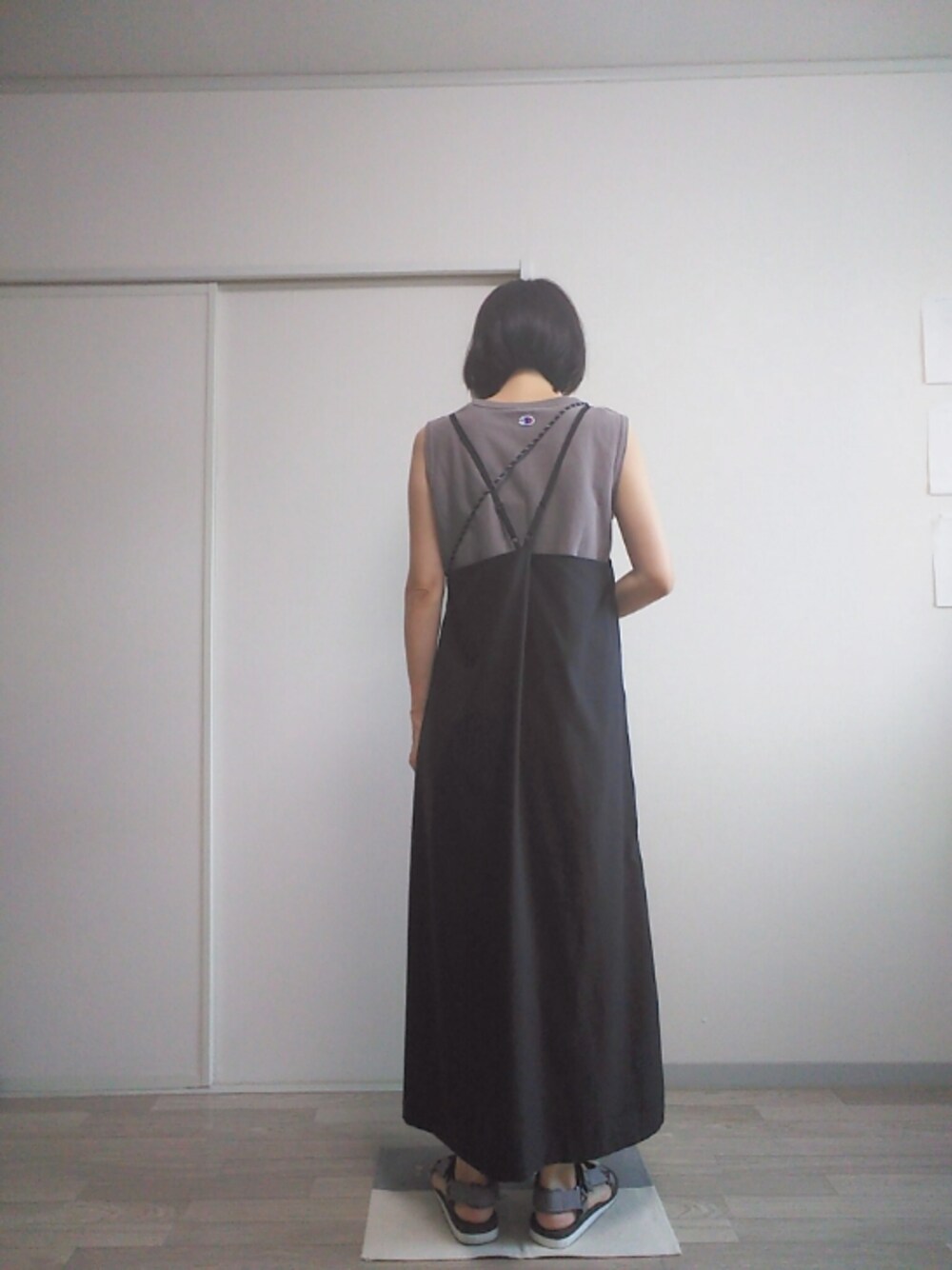 ノースリーブカットソーはナノユニバース。 くすんだパープルみたいな色。 キャミワンピを合わせました。 合成繊維でツルツル。 どちらも何年か前のものですが、気に入っていて今でもよく着てます。 トップスがチャンピオンなので、靴は合わせてスポサン。 ミスして鞄が見えない…。 黒いサコッシュでした。