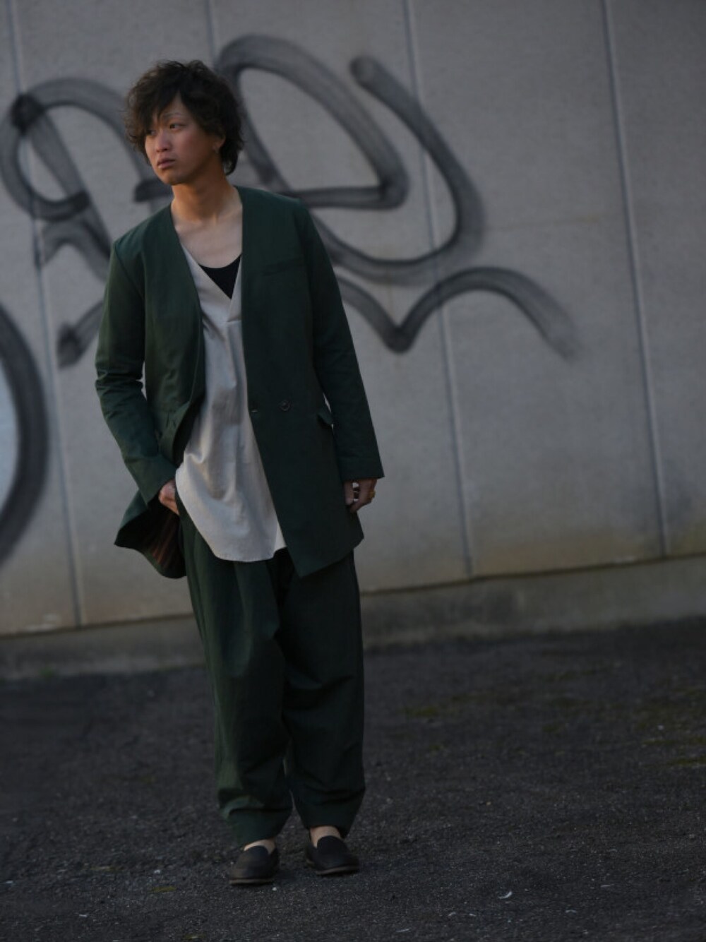 今季のYANTORも素晴らしいです。 グリーンのセットアップコーデ 若干扱いにくいと思いがちなグリーンですが このくらいの暗めな緑ですとさらっと 着ていただけると思います。 定番の6タックパンツ ボリュームがあり動いたときの雰囲気もまた 良きです。