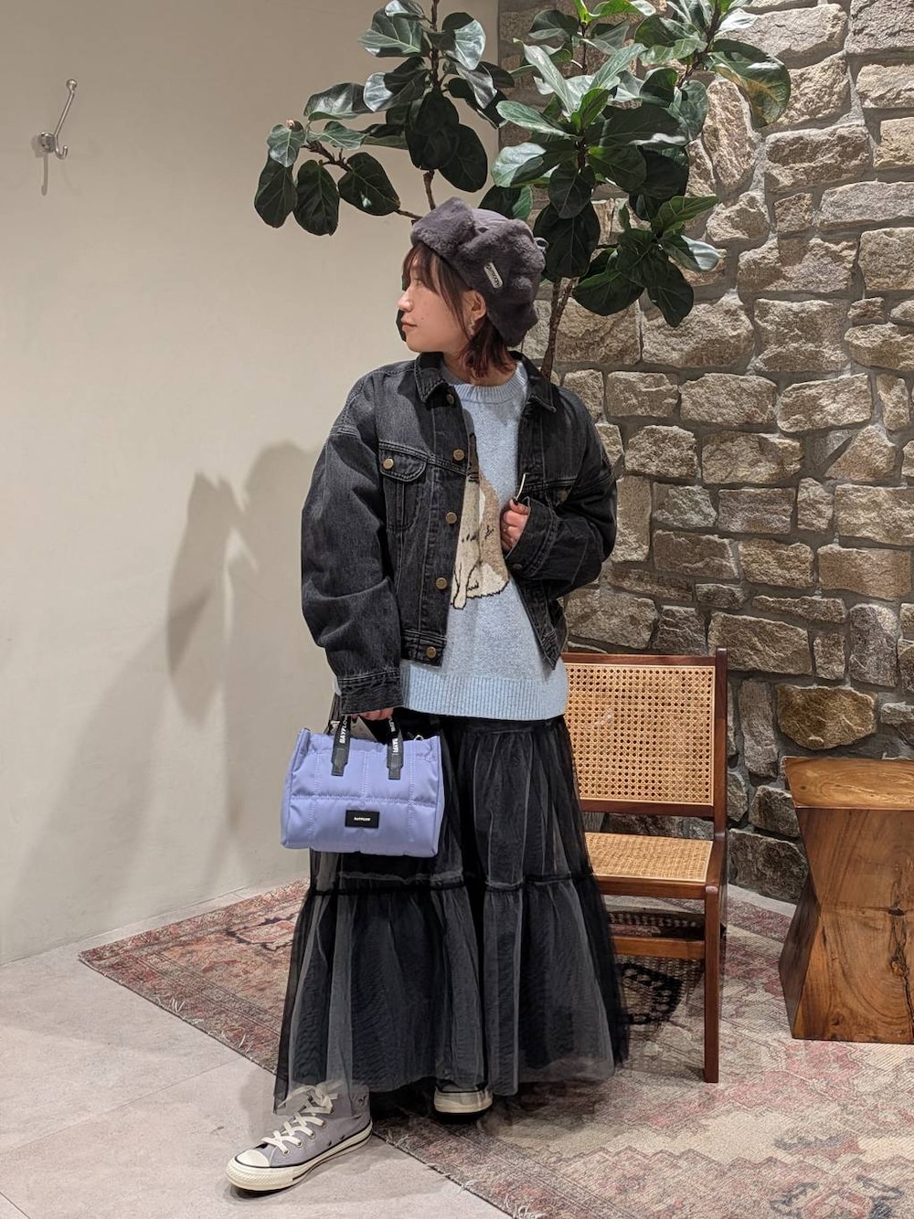 人気猫ニット🐾もちもちした肌触りが温かい🧶 スカートや帽子などグレーで統一、個性的なアイテムでカジュアルコーデしています!コンバースのハイカットスニーカーもグレー、サイドジップで履きやすい🎶 スカートは二枚重ね。外側と内側で別々に使えるセットなので、シアーとデニムを組み合わせたり、単独で内側を使ったり多様性がお得感👍️