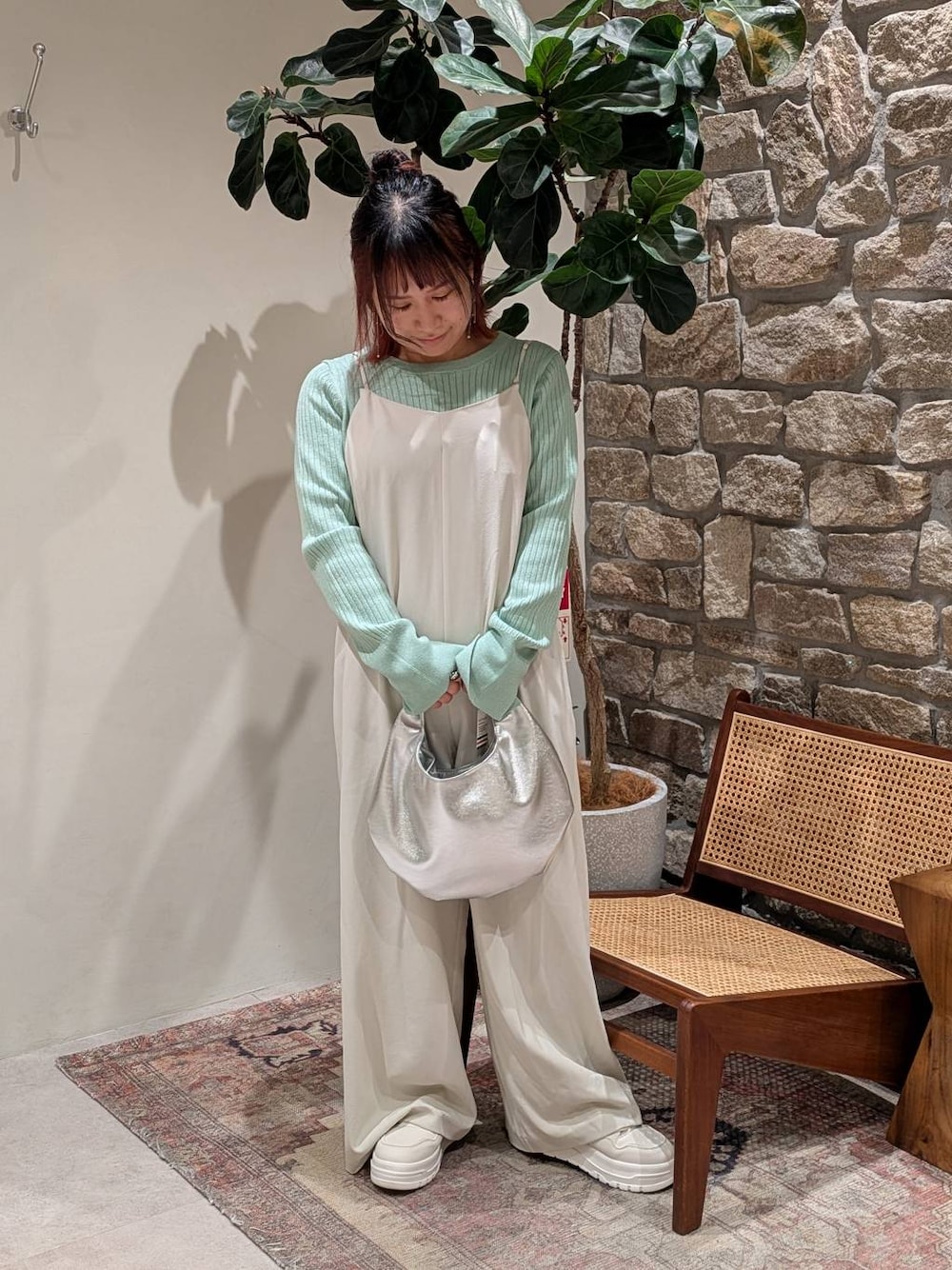 肩ストラップが2種類、コーデで変えて使えるサロペットです! チェーンタイプは調節出来ないので、低身長さんにはシンプルなストラップをオススメ!MAX短くしておりますが私はさらに厚底スニーカーはいてます笑 生地が綺麗だから、ジャケットやシャツで組み合わせたらフォーマルなコーデにも使えますね👍️ 女子力高めの春色ニットは袖のスリットやラメが可愛い♡