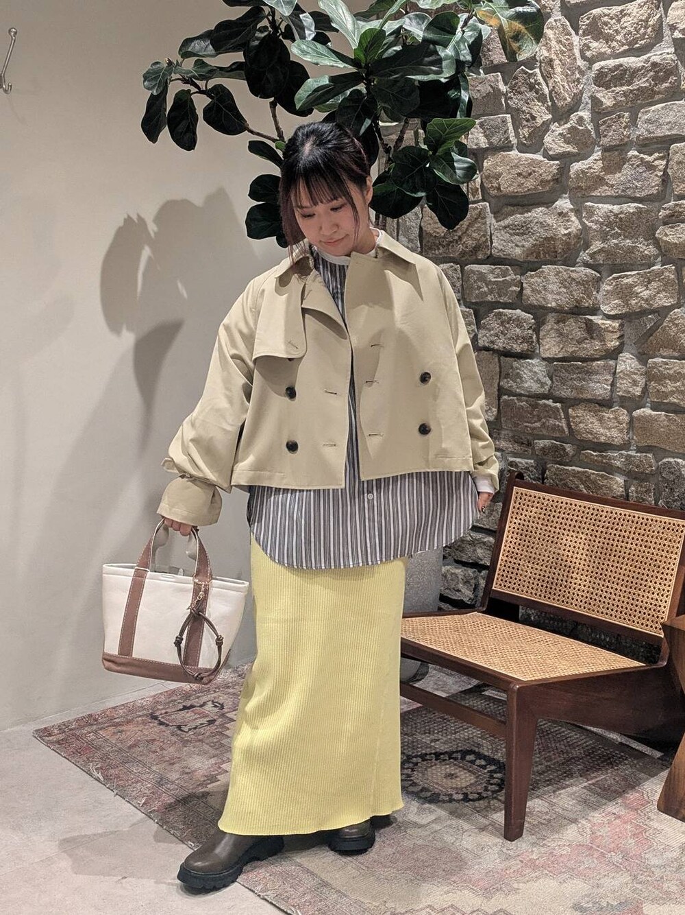 サイズで異なる丈感の春アウター🌸 こちらはショート丈Sサイズ。カジュアルな雰囲気だけど上品な柔らかい質感のトレンチです!腕周りがゆったりしつつ、袖のベルトを調整したら長さも整ってデザイン性も可愛いので一石二鳥♫ 定番リブタイトカートは春カラーが新鮮! 私の場合、ストライプシャツはあえてウエストインしないほうがバランスが良かったです👍
