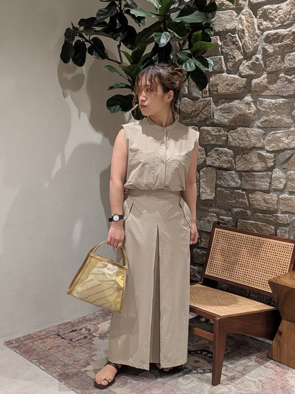 ✽✽✽HEREIAM✽✽✽ セットアップコーデ!人気シリーズからノースリーブシャツでました〜 インして着るとワンピースみたいな統一感で、大人女子らしい雰囲気✨ 低身長でもなんとなくバランスが取れて良い見栄えではないですか♡おでかけやお子さんの行事にもおすすめです! 涼感でシワもすぐ取れちゃう有能素材。ベージュ透けにくいです✌