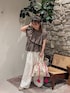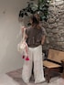 フリルがアシンメトリーで使われているピグメントのTシャツ!私はちょっとユーズド感がある絶妙なブラウンのテイストが好きです♫ パンツはホワイトレースのワイドで全体的にラフなシルエット。ウエスト一折+厚底で丈がやっとですが、好みなので諦めずに履いてます笑。 カラーやデザイン・素材、靴・バッグがどれも絶妙にバランスを取り合ってくれてる甘すぎないコーデになったと思います!きっと(自己満です笑) 基本はシンプルな組み合わせなので個性的な巾着バッグでポイント⤴☀