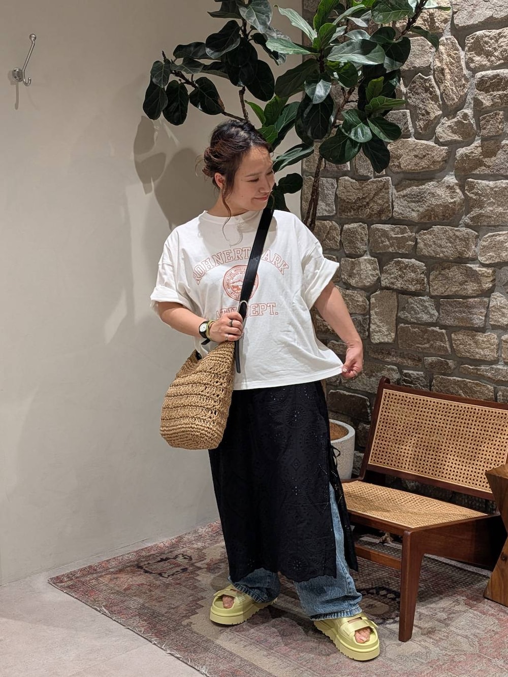 Tシャツにデニム👖シンプルもいいけど、レイヤードで今年っぽさをプラスしましょう! 裏地がペチコートのように分かれているスカート。綿100%の刺繍デザインはカジュアルなテイストと相性◎ 私には長かった+ウエストゴム、ということで、コチラ実はベアトップのように着ています笑 おかげで下にはいたデニムがちゃんと見える丈になりました👍️ Tシャツは店頭でも人気!ヴィンテージ感のあるビッグTは体のラインを拾わず、ベアトップも拾わず笑 バッグは長さの領域がすごい!両サイドのバックルが調節可能なので、短〜長の幅広さがめっちゃ優秀で、トートでもショルダーでも好きなスタイルで持てます✨