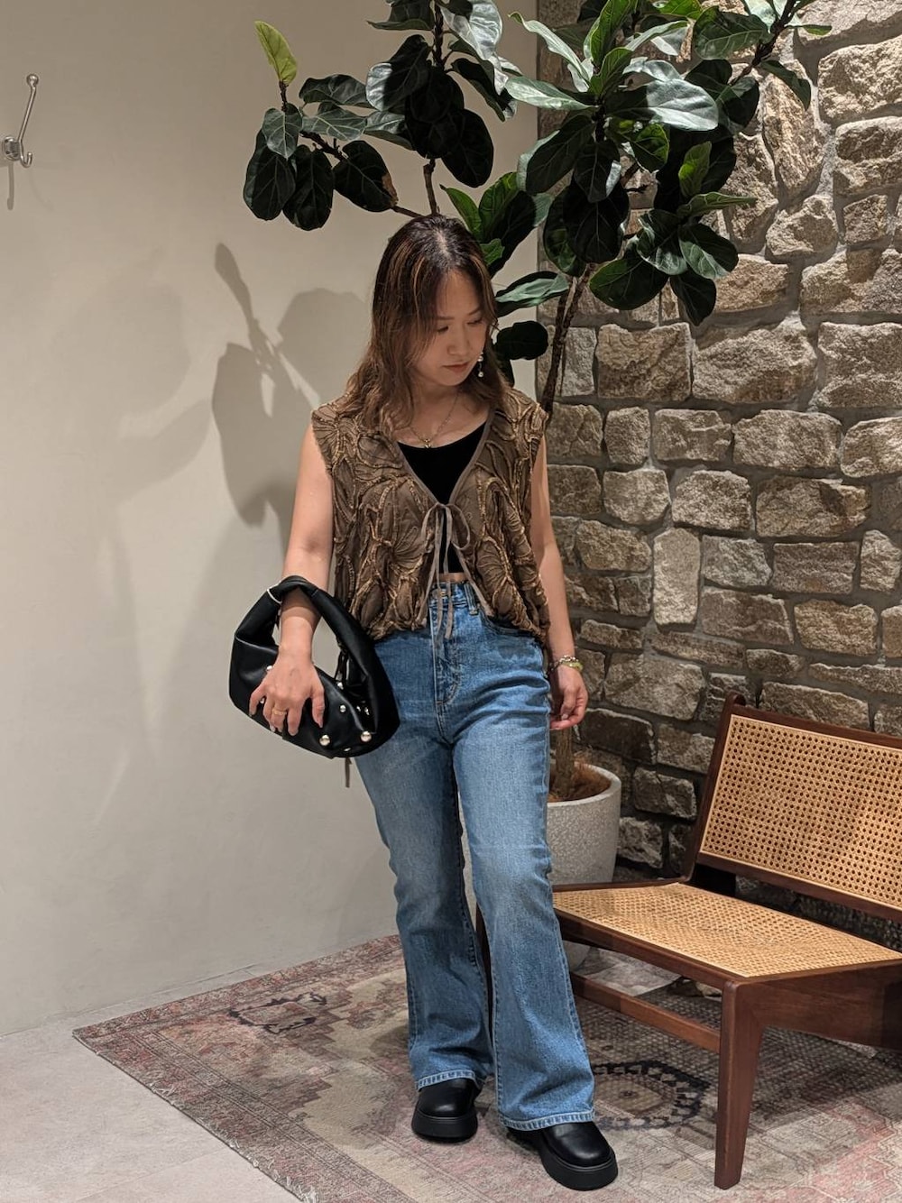 シンプルデニムコーデ👖×ブラウンベスト 小物達をブラックレザーでハードめにしたら、デニムとのバランスがヴィンテージ感というかノスタルジックというか🌵 モールが秋っぽいけど透ける程度の薄いベスト。ノースリーブや半袖Tシャツなどに、秋冬はシアートップス・ロンT・ニット◎私はワンピにも合わせたい!コーデにプラスワンアイテムです!ということで購入♡ちなみにブラック。どの色も可愛くて悩みに悩んで🥹笑 ウエストの後ろ側がゴムで動きやすいデニムは、148には少し長いですがサボサンダルと相性◎新しいフレアはお尻や太もものフィット感増して、良い塩梅になってます👍️