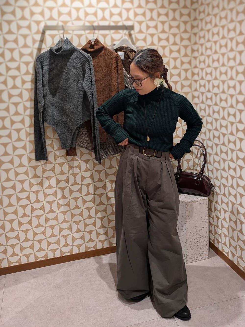 ✽✽✽ EF ✽✽✽ 深めグリーン+絶妙グレーパンツのカラー合わせが大人可愛くてオシャレ✨ ニットはロンパース型で、見せるのがオシャレなんだと思いますが、40は勇気ないのでインします笑😂背の高い方がインすると腰チラ見えでヘルシー🧶 パンツは大きめで長かったですが、私好みなポイントたくさんあります♡色も可愛いし形もステキだし、生地も柔らかいけどしっかり良い味のあるハリ感というか。何よりベルトのループがオシャレ!これはわざわざベルトしたいパンツです♫ ベルトでハイウエストキープしつつ、裾は内側に折って撮影しています(10センチくらいは折ったかも笑) アウターも可愛!ブラウンとチャコールがありますが素材がそれぞれ異なります。私はブラウン派👍️中に大きめニットを着てももたつかないオーバーサイズのジャケットでこの冬たくさん活躍しそう🫶