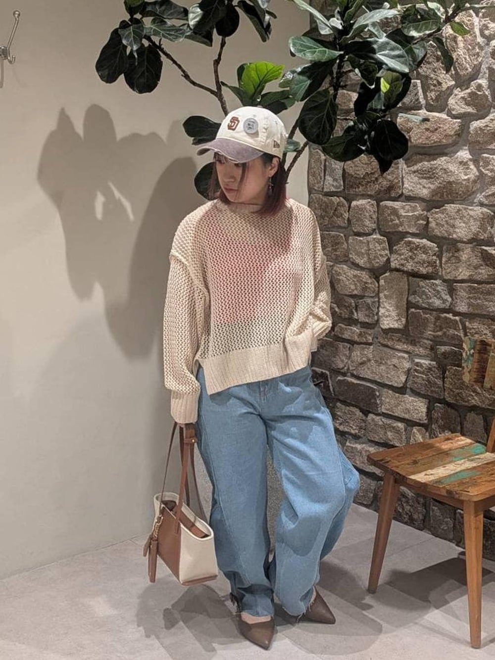 シンプルコーデで着比べます!SとМどっち派? 緩く楽ちんに女性らしい春素材🌸 ニットは2サイズで、長さが違います。ゆったりしていて首元も空きすぎず安心して着られます👍️ Sサイズは私でウエストが隠れるくらい(お尻に少しかかるくらい)インしやすい丈感で、今回はバレルデニムでコーデしました!太めのボトムとの相性◎ 優しい色味のベージュには、インナーのタンクにはアクセントでレッド使用🔴 バッグがオトナ可愛いのでお気に入り♡肩からもかけられる持ち手の長さも丁度いいんです! 次の投稿ではニットのМサイズを着て、バッグも色違いコーデしてるので、ぜひみてください😊