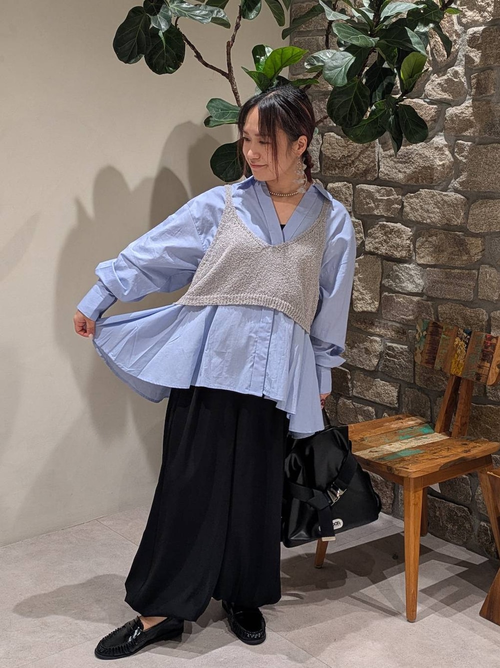 ヘレイアムのブラウスにビスチェをプラスして、モードスタイリング✨ ペプラムシルエットで単独で着ても可愛いブラウス!ビスチェをレイヤードすることで、ボリュームパンツと合わせても全体ラインが締まるし今っぽさも◎ バルーンパンツのくるぶし部分にはボタンが2つあり、足首周りの調整可能。落ち感のある素材にキレイなタックが入り、バランスの良いボリューム感を出してくれています♡モデルさんのように足首見えてないけど笑、丈問題クリアなので小柄さんにもペタンコ靴で履けちゃいます👍️