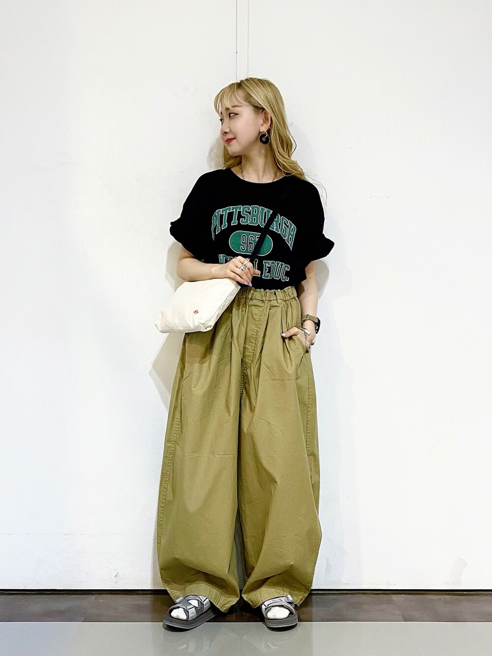 ロゴTとバルーンパンツで定番カジュアル◎ 春夏定番のTシャツも オーバーサイズで今っぽいシルエット。 ずるずるっとラフなシルエットの着こなしなので 袖をロールアップして女性らしさをプラス◎ 袖は肘までしっかりある長さなので 二の腕もカバーできます! 足元もスポサン合わせでメンズライクに。 なかなかないグレーのカラー、お洒落です◎
