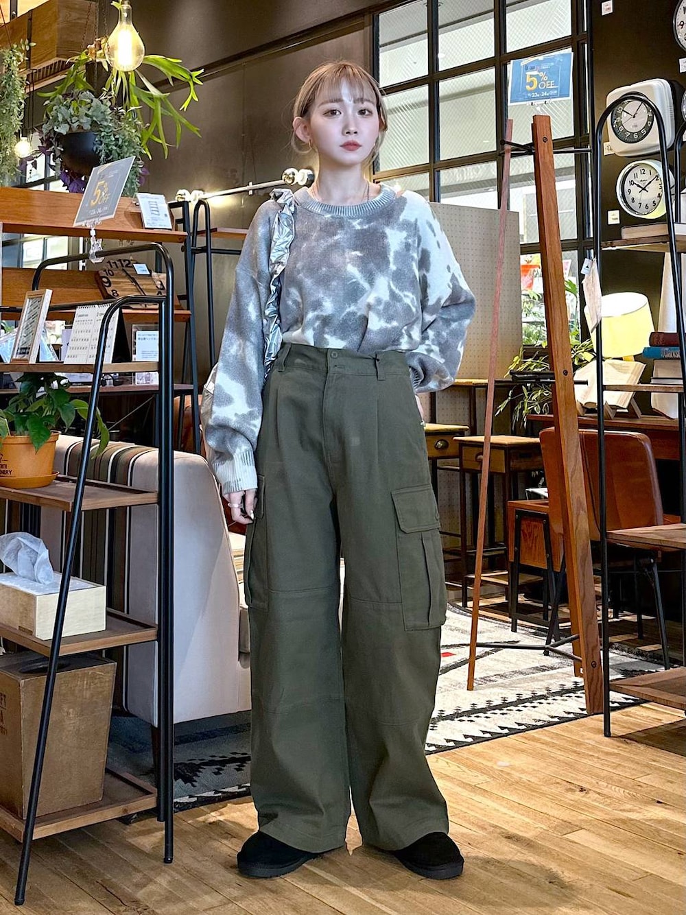 新作ニットはタイダイ柄 🧶 肩の切り込みも可愛い〜買って帰る〜〜 !! カーキのパンツと合わせて アースカラーの大人コーデ ^_^
