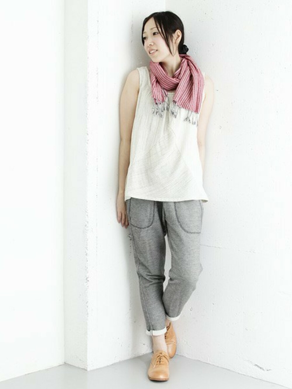 ノースリーブにイージーパンツを合わせた楽ちんスタイル。赤チェックのストールをアクセントに。