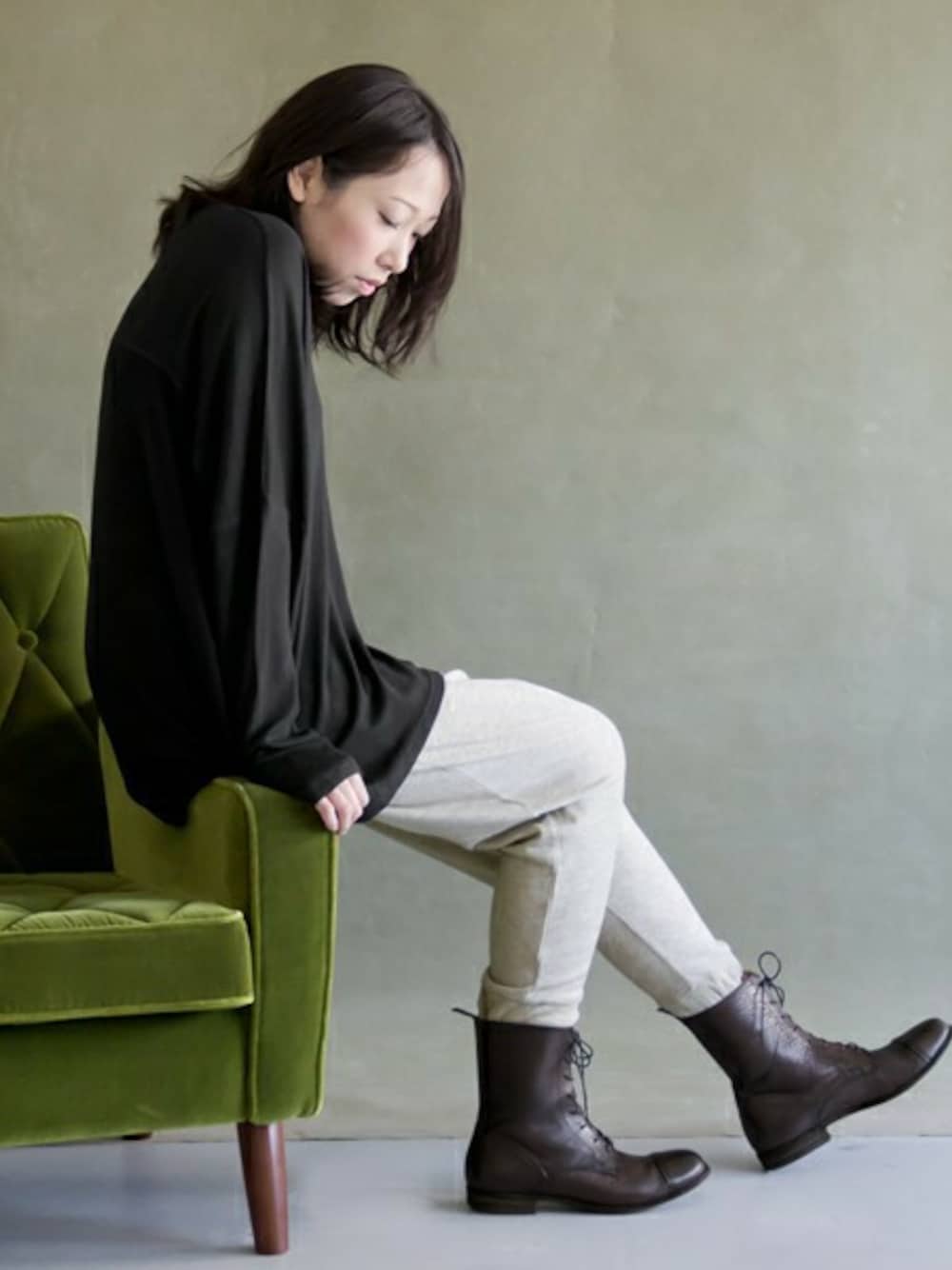 カラーをぐっと落とした秋スタイル。 少しだぼっとした大きめシルエットのトップスは後姿もきれいです。