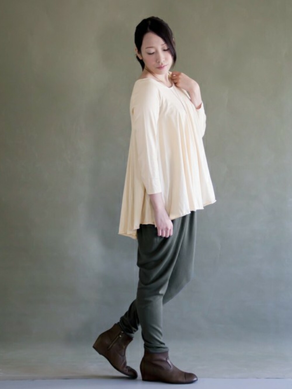 たっぷりギャザーのトップスとドレープが美しいジョッパーズを合わせた贅沢スタイル。 上質な素材感を味わえます。