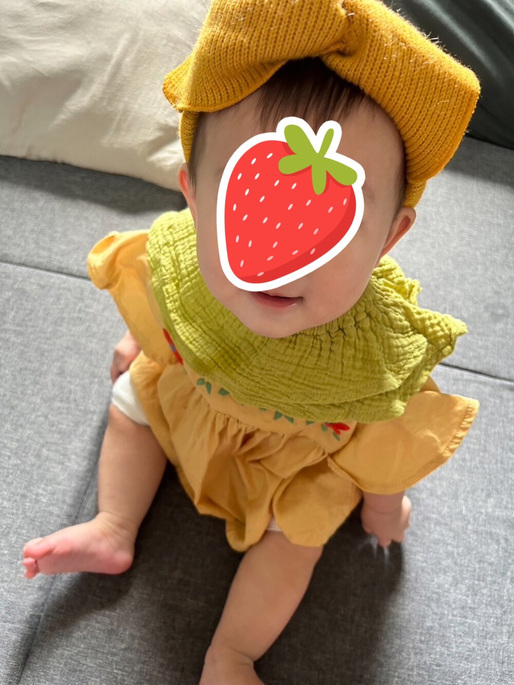 イエロー系のママ&ベビーを着用したレディースの秋コーディネートの1枚目の写真