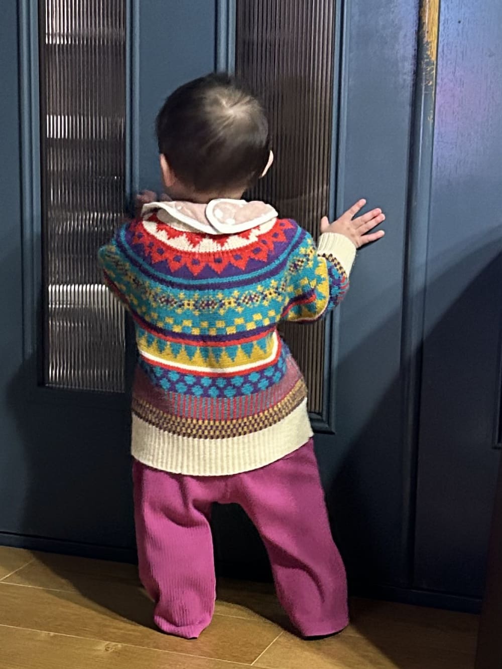 いつかの孫コーデ カラフルニットに派手色パンツ❣️ かわい👍 ほんとはデニム合わせてたんやけど ジュースこぼしちゃってんな😭