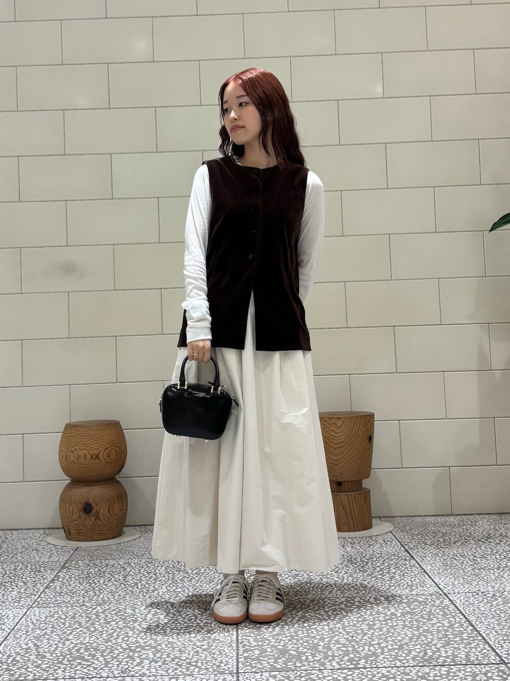 *トップス トップスとしてもインナーとしても大活躍なシアーロングTシャツです。スッキリとしたシルエットが◎ *ベスト 秋に取り入れたいベロアベストです。丈感長めの上品なデザインがスタイリングを引き締めてくれます。ボタンが可愛くてお気に入りです♡ *スカート しっかり広がるボリュームスカートです。ウエストゴムと紐で調節可能です。裏地があるので、安心です。 *バッグ コンパクトで高級感のあるエナメルバッグです。金具のゴールドがさらに上品な印象を与えてくれます。 *シューズ 馴染みの良いカラーで、スタイリングに取り入れやすくカジュアルにもキレイめにも合わせやすい一足です。 ご覧いただきありがとうございます!