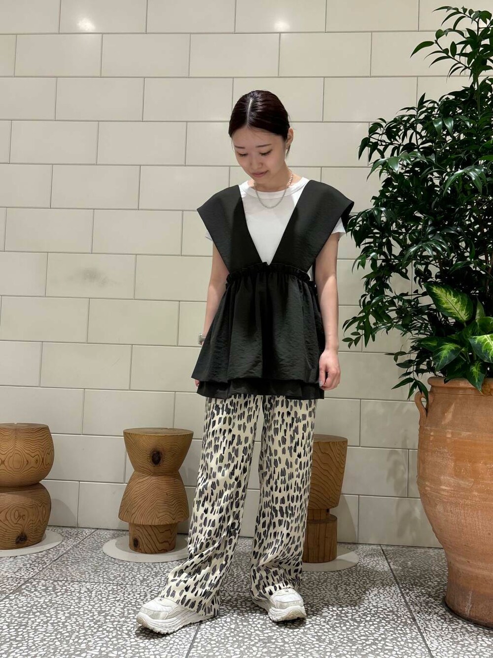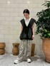 パンツの柄の色味とマッチしたベストを組み合わせたスタイリング *トップス・ベスト ベストの存在感を出すため、シンプルなTシャツと合わせてみましたが色物やロゴTなどに合わせても◎ 肩部分は余る感じで着ていただくイメージです。 ボリューム感があって可愛いです。 *パンツ 155センチで丈感長めです。ソールの高い靴を合わせていただくといい感じになります◎ テロテロした生地ですごく楽に履いていただけます。ウエストは紐で調節できます。 ご覧いただきありがとうございます!