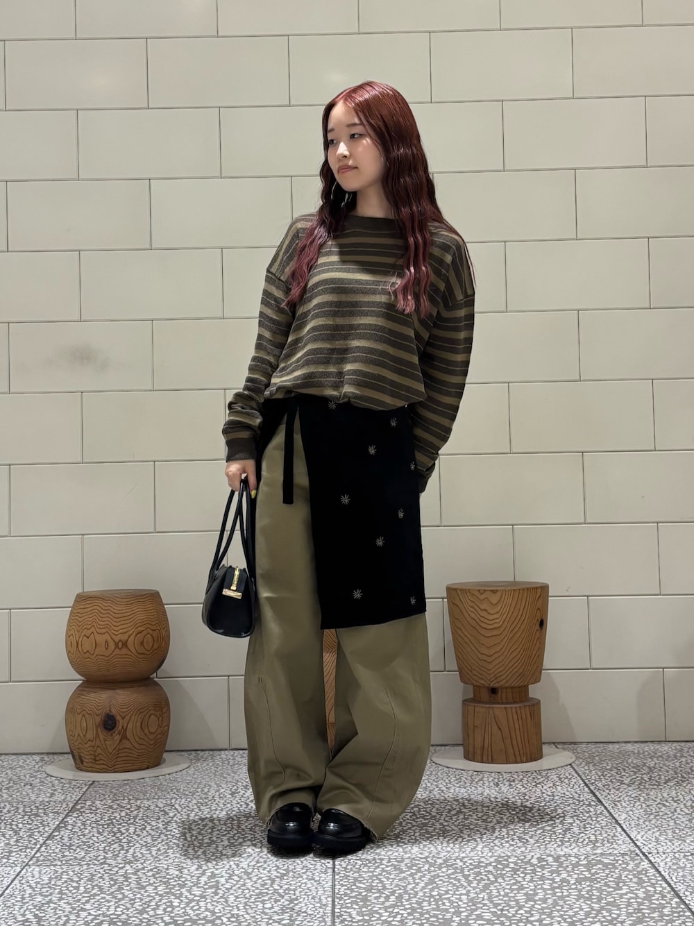 *トップス 配色が可愛い主役トップスです。ゆるっとしたサイズ感が着心地良く、こなれ感の出る1枚です。 *スカート ベロア生地に刺繍が施された贅沢なアイテムです。物足りない時に取り入れるだけスタイリングが完成します。 *パンツ 柔らかくて履きやすく、裾の切りっぱなしデザインと緩めのシルエットが◎大活躍間違いなしのパンツです。 *バッグ トレンド感のある横長バッグです。シンプルでスタリッシュなデザインがデイリーに取り入れやすいです。 *シューズ とても軽いので履きやすく、長時間履いても◎足元をしっかりと締めてくれるデザインで重宝しそうです。 ご覧いただきありがとうございます!