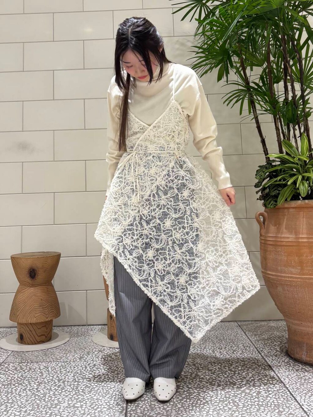 *トップス 一枚でもインナーとしても広く活躍してくれるニットです。しっかりとした生地感で暖かいです。 *ワンピース フレアシルエットの華やかなキャミワンピースです。これからの時期のレイヤードスタイルで大活躍しそうです。肩紐はサイズ調節可能です。 *パンツ ゆったりとしたシルエットのパンツです。 細いストライプで縦のラインが出るのでスタイルアップ効果◎ *シューズ スタッズが存在感を感じさせるミュールです。丈感長めのパンツと合わせてチラッと見せるのがおすすめです。 ご覧いただきありがとうございます!