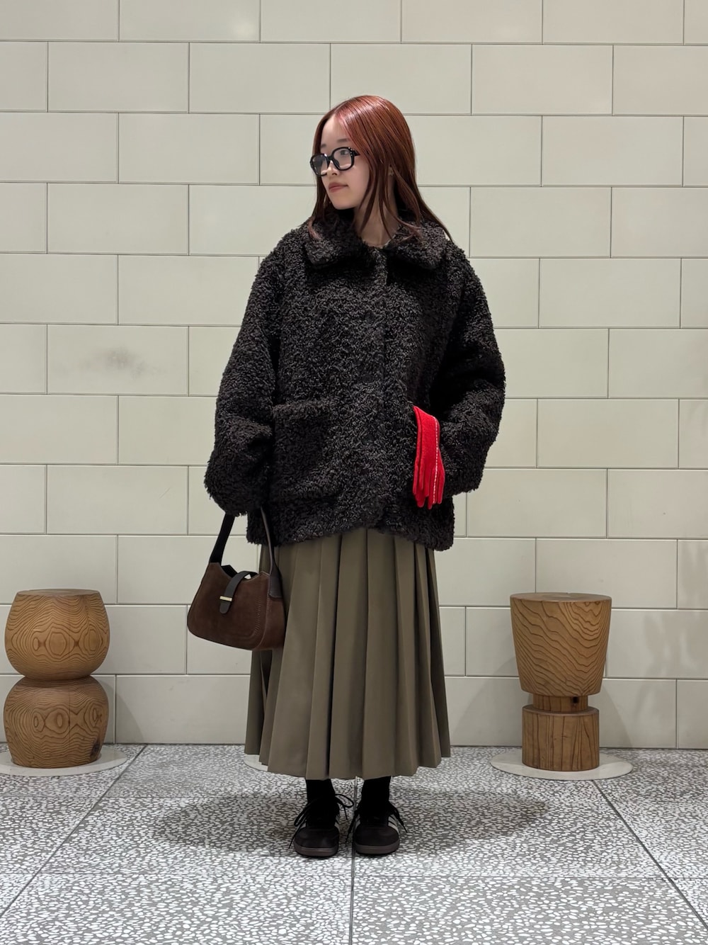 *トップス シアー素材が全体的に抜け感を与えるトップスです。綺麗めにもカジュアルにも合わせやすい1枚です。 *アウター ボリュームが可愛いカーリーファーコートです。軽くて羽織りやすく今季の主役アウターになります。 *スカート 今季取り入れたいプリーツラップスカートです。一枚でもレイヤードアイテムとしても活躍してくれそうです。 *バッグ スウェード生地が季節感のあるブラウンバッグです。普段使いしやすい小ぶりなサイズ感が◎ *シューズ 別注のadidas SAMBAです。 深めのブラウンが落ち着きがあり、ゴールドの刻印が上品な一足です。 ご覧いただきありがとうございます!
