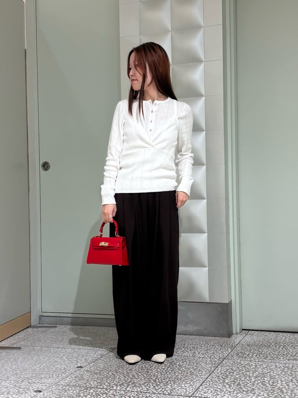 *トップス 可愛らしいパターン生地のヘンリーネックニットです。丈感長めでゆるさを出すならアウト、スッキリ見せたい時はインで使い分けられそうです。同素材のキャミソールと重ねても◎ *トップス ニットと同素材のキャミソールニットです。お持ちのトップスにレイヤードしてシーンに合わせた着回しができそうです。 *ボトムス ウエストゴムのリラクシーに履けるスラックスです。トップス次第で綺麗めにもカジュアルにも対応可、サイズ展開があるのも嬉しいポイントです。 *シューズ マットな生地感で落ち着きのあるシューズです。馴染みやすいデザインでどんなスタイリングにも取り入れやすいです。 *バッグ 真っ赤な色が存在感のある小ぶりな2WAYバッグです。デザインや金具が上品な印象で、スタイリングが引き締まるアイテムです。【ROSSO/AULENTTI/CR26110-2225058/クラスプ トップハンドルバッグ】 ご覧いただきありがとうございます!