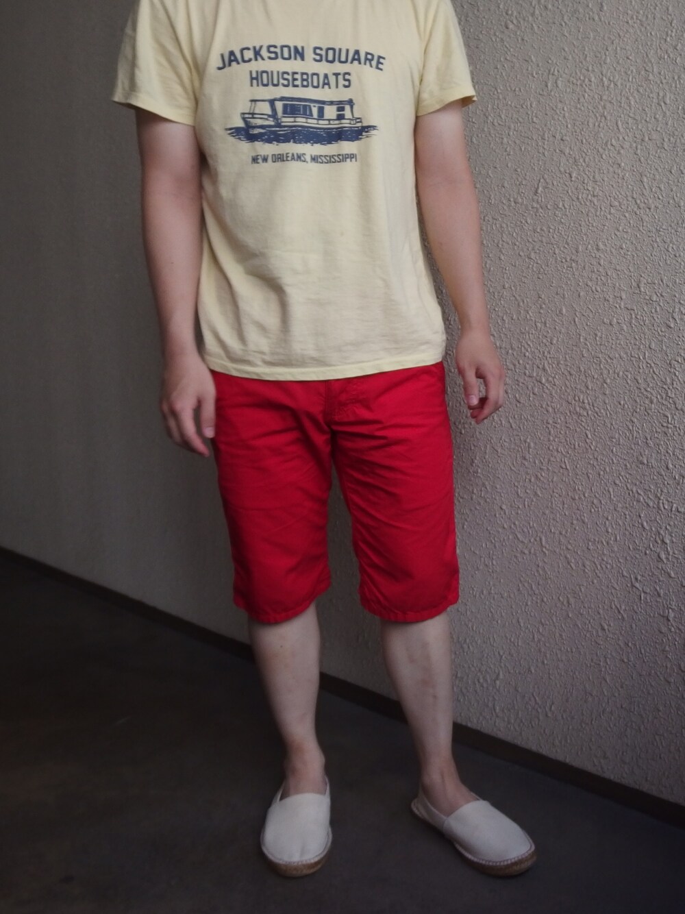 明るい赤のショートパンツ