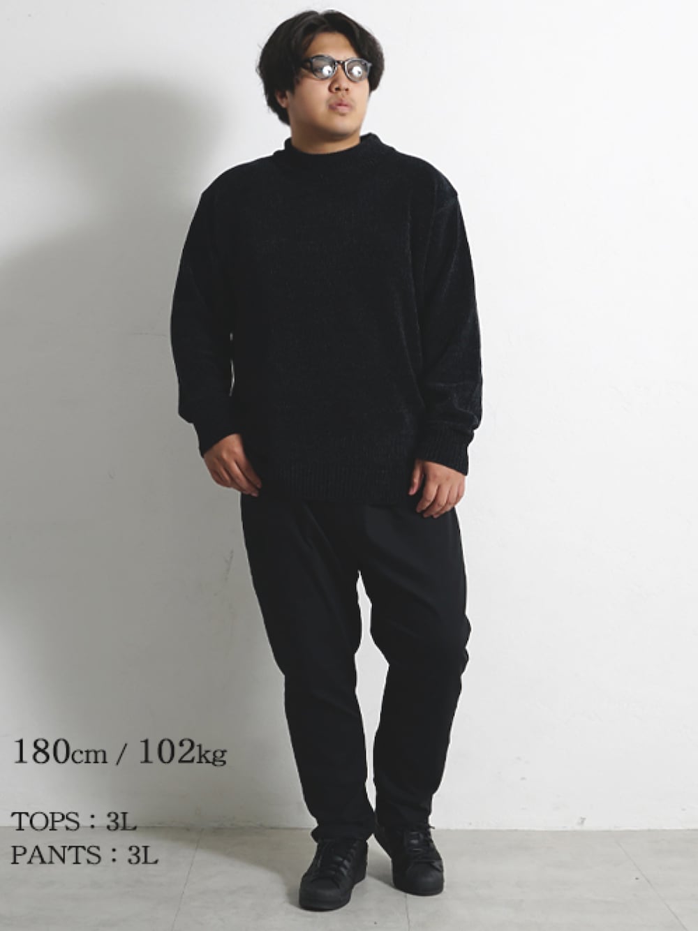 ソフトさの中に光沢感がある、上品な大人のモールヤーンニット(短い毛羽のあるニット)を使用したセーター。 首もタートルネックよりも高さの低いネックラインのモックネックを採用。 トレンド感のあるデザインにシックなブラックコーデが大人の雰囲気を醸し出します。 [大きいサイズのイワショー] で検索! トップス 商品番号:66588 6,050円 (税込) パンツ 商品番号:66313 4,950円 (税込) ------------------------ ONLINE STORE[公式オンラインストア] https://www.rakuten.ne.jp/gold/qwerty/ ------------------------