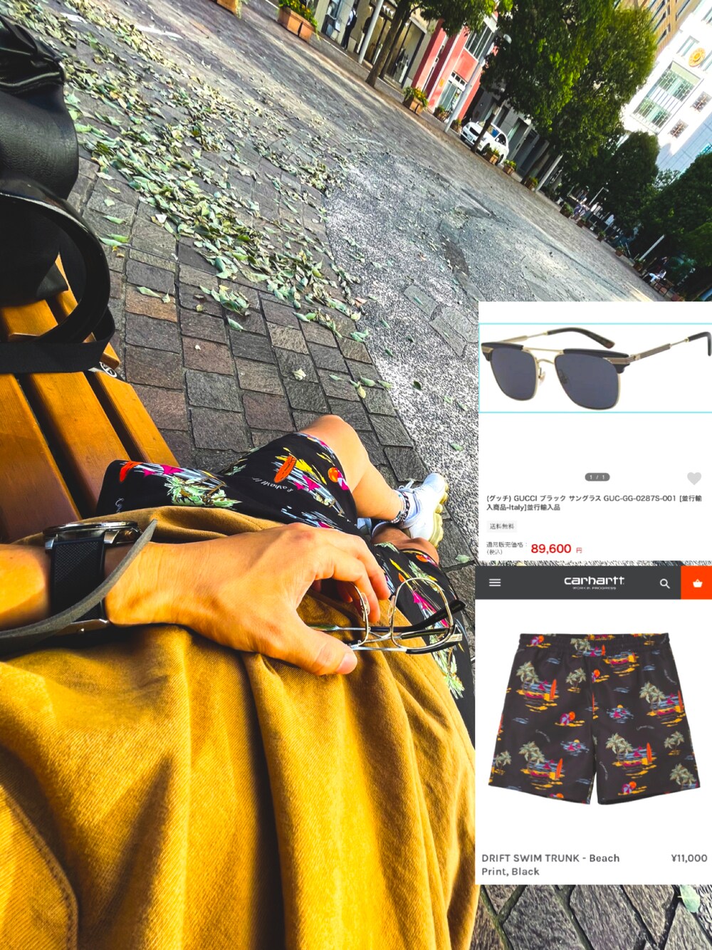 三井ガーデン イタリア街 ここはほんと撮影に使う人が多い。 そんな自分もでしたがベンチで一休み。 Carharttのハーフパンツは今季の買いでした🌴 Gucciのサングラスはこのフレームなんか違うと感じてぶち抜いて伊達メガネに。