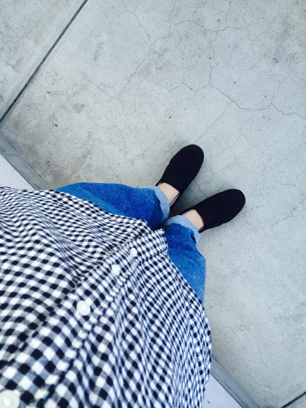 _ ギンガムチェックシャツ/UNIQLO ボーイフレンドデニム/KINJI スリッポン/?