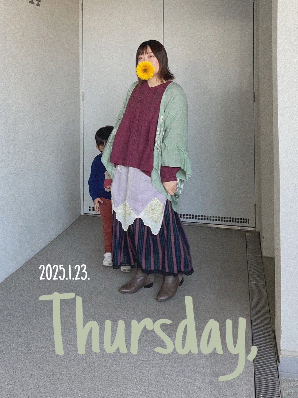 対照的な色なのに 緑と紫の組み合わせが好きで 合わせてしまった 羽織り浮いてる気がするな 高円寺のお店で買った古着のスカート 大須で買ったオーガンジー生地のエプロン どちらもお気に入り 羽織りが余計だった感が否めないので もっと暖かくなったら羽織り無しで着る!