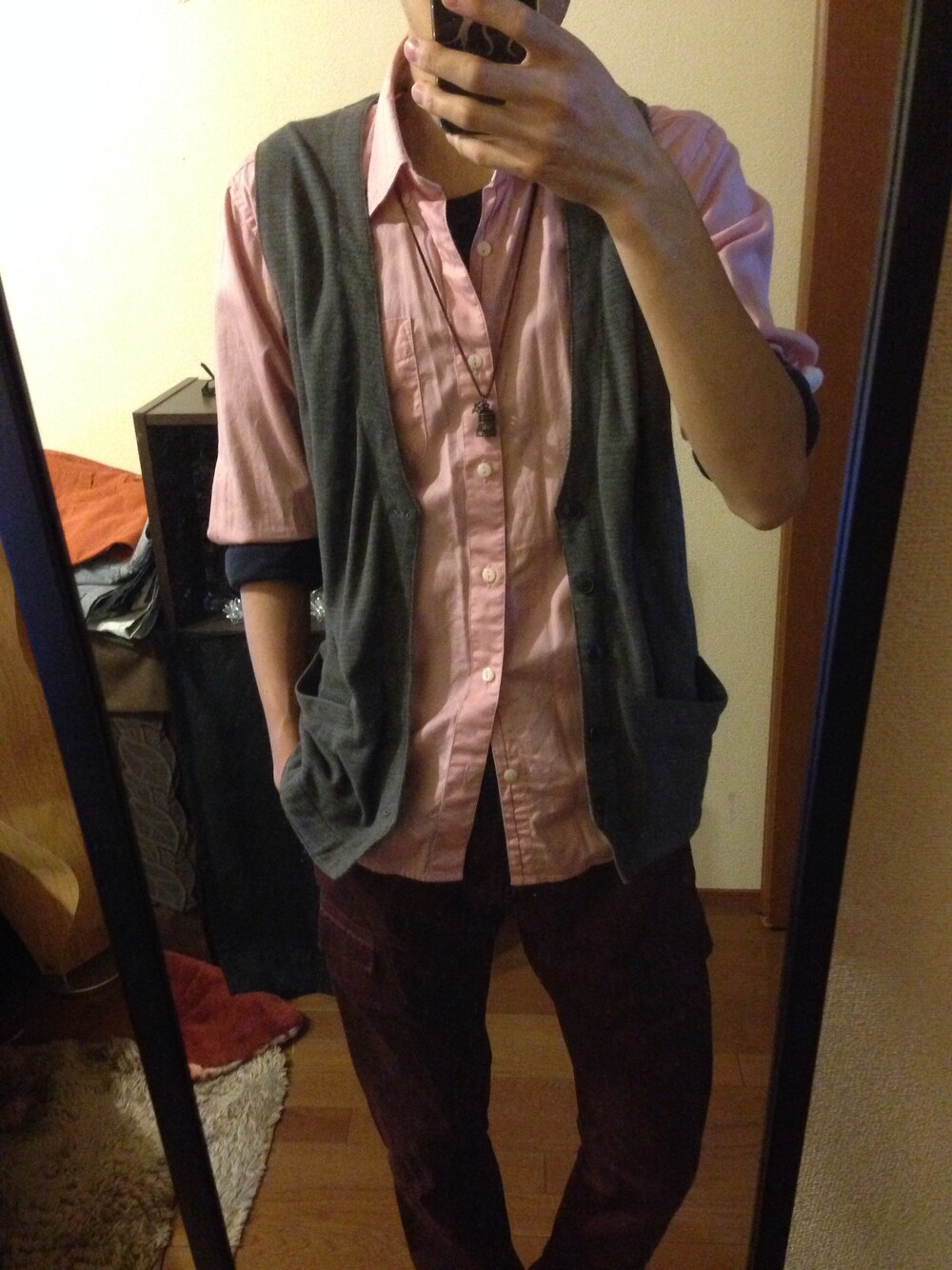 シャツ:ikka ベスト:ikka ピンクシャツ×レッドパンツ ピンクと相性の良いネイビーとグレーをインナーとベスト