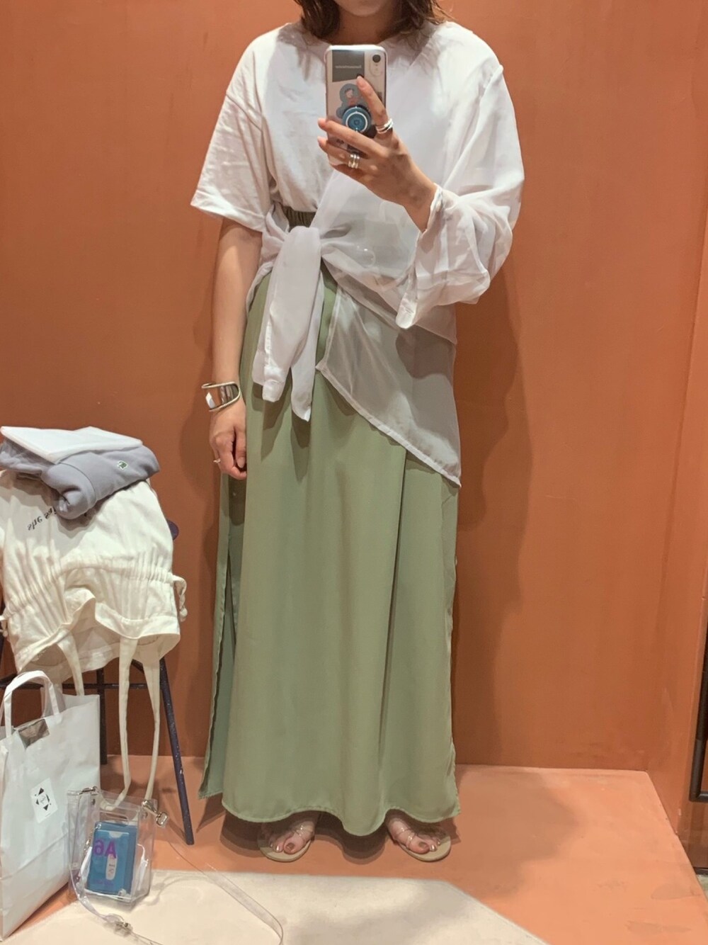 シースルのシャツ巻いてゆるゆるコーデです