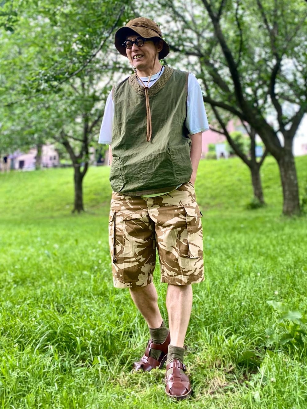 白Tに重ねたナイジェルケーボン⭐︎ホスピタルベスト(サイズM)は🇫🇷フランス陸軍のヴィンテージアーミーベストが元ネタ⭐︎。当然のようにリバーシブル仕様で、今回はストライプキルトが見えない裏面出しで着用してみました😁。 ボトムスは🇬🇧イギリス軍デザートDPMカモのコンバットショーツ、足元は栃木レザーのグルカサンダルと、適度に(?)ミリタリー なショーツスタイル♪ ネックレスは🇨🇿チェコガラスのハンドメイド品。