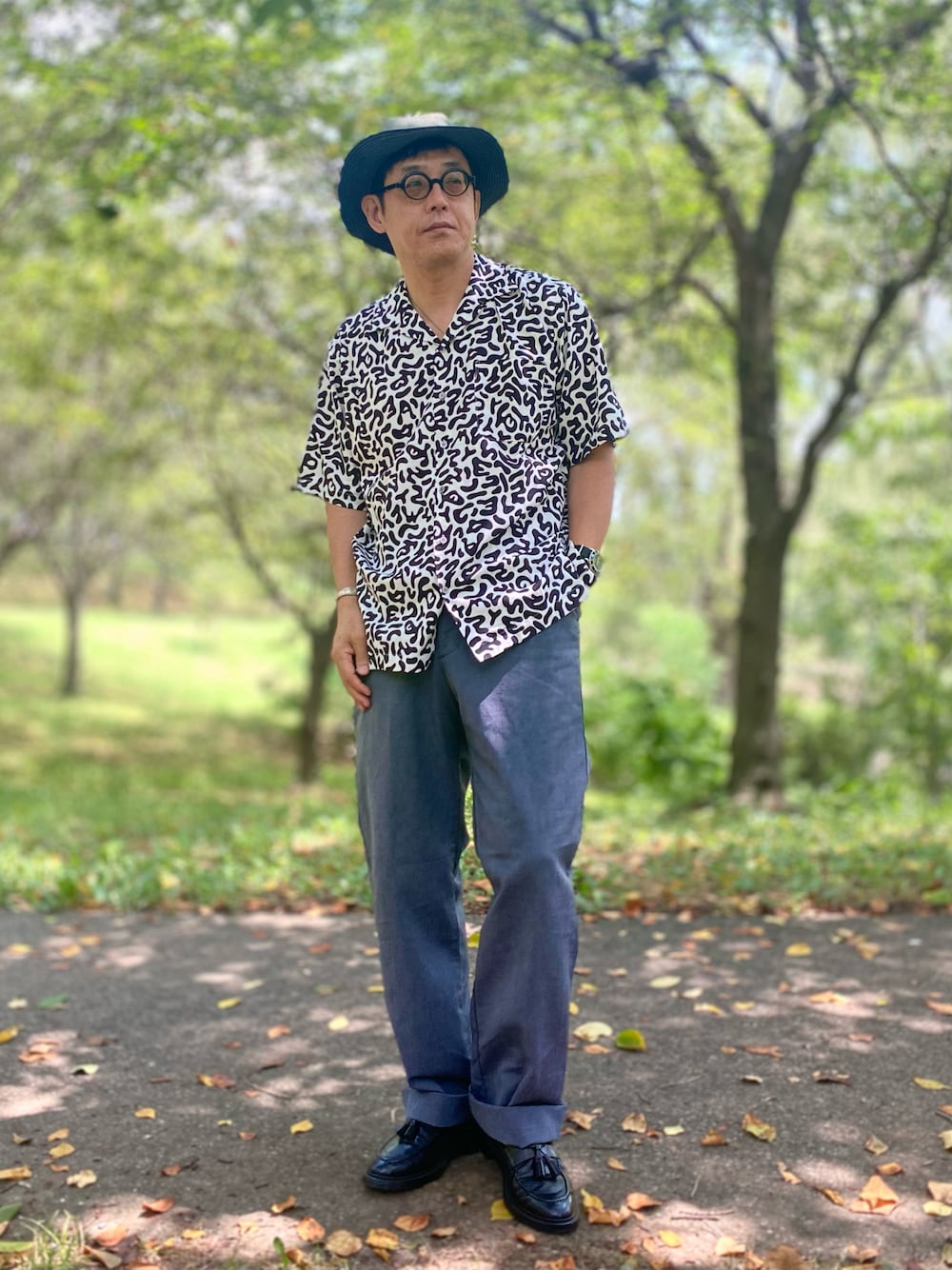 クセあり @waiper_inc アメーバカモ シャツ(サイズL)の他はシンプルに😁。 ん?アメーバ柄、意外と使いやすいかも? 米軍 HOSPITAL DUTYトラウザーズ GRAY染め(サイズ34/34)履いて、足元はタッセルローファー、帽子はALMW🎵