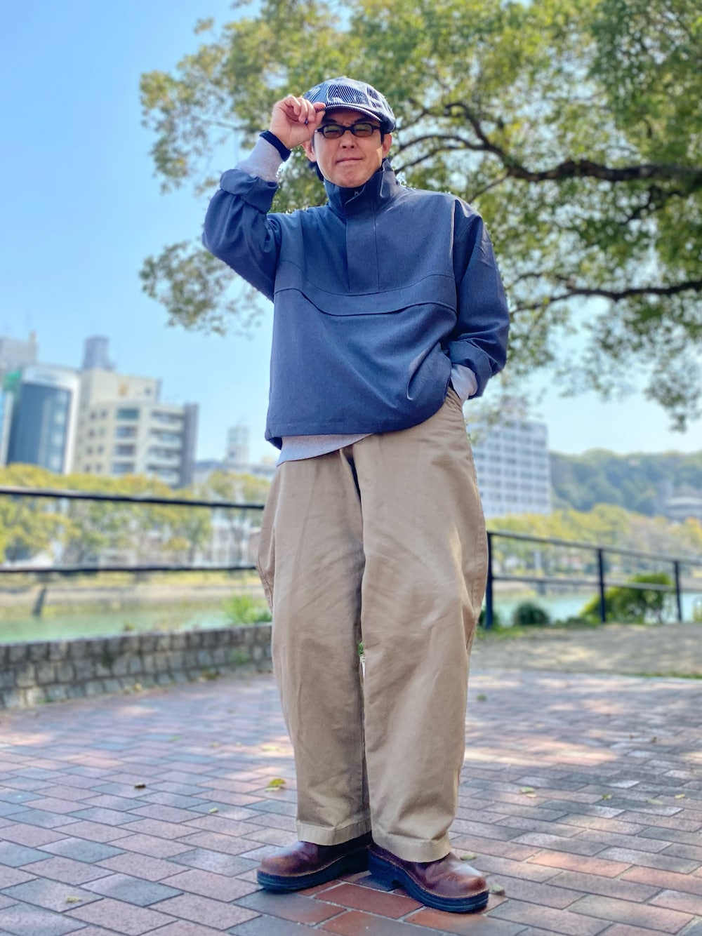 グレー系のその他アウター、ベージュ系のチノパンツを着用したメンズの春コーディネートの1枚目の写真
