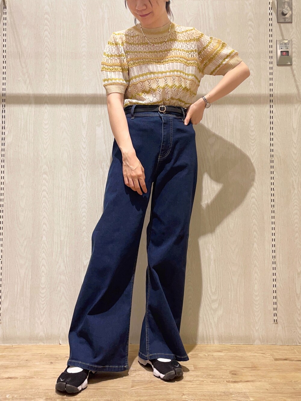 トップス:Fサイズ ボーダーが目を惹くサマーニット🌻 ピタッとしすぎず、通気性◎でした! ボトムス:Mサイズ ウエストは少し緩く感じましたが、158cmで長さはちょうどよかったです!ストレッチ効いていてとてもはきやすかったです!