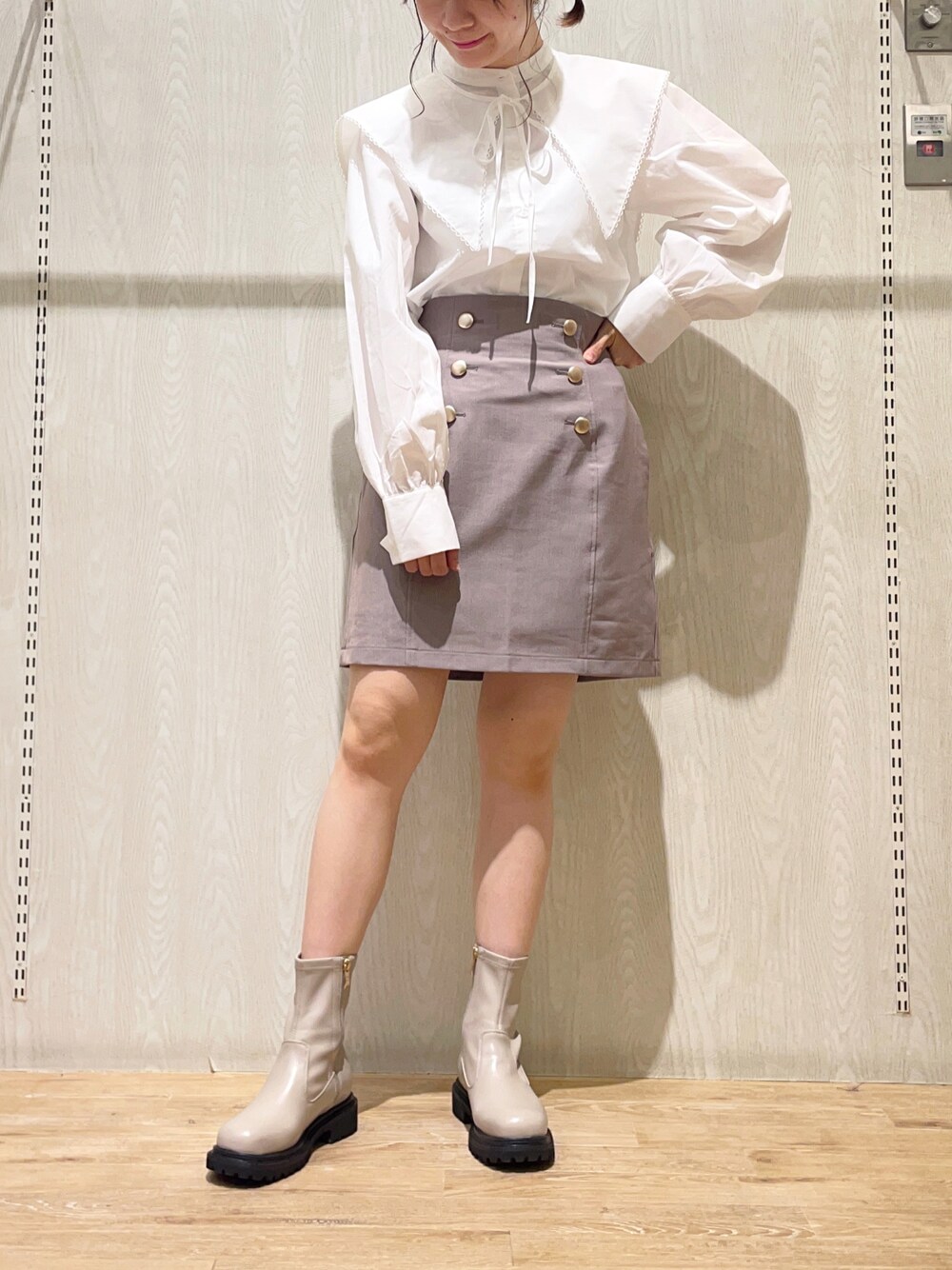 instagram→@sunset___7 ●トップス 普段着用サイズ:M 今回着用サイズ:F 襟が取り外しできるブラウスです。大きな襟が印象的でお顔まわりを華やかにしてくれます。ほんのり透け感があるので同じ色のインナーを合わせるのがおすすめです。 ●ボトムス 普段着用サイズ:M 今回着用サイズ:S 158cmで膝上くらいの丈感でした。ウエストはSサイズで少し余裕があるくらいでしたが、トップスをインするとちょうど良いくらいのサイズ感でした。