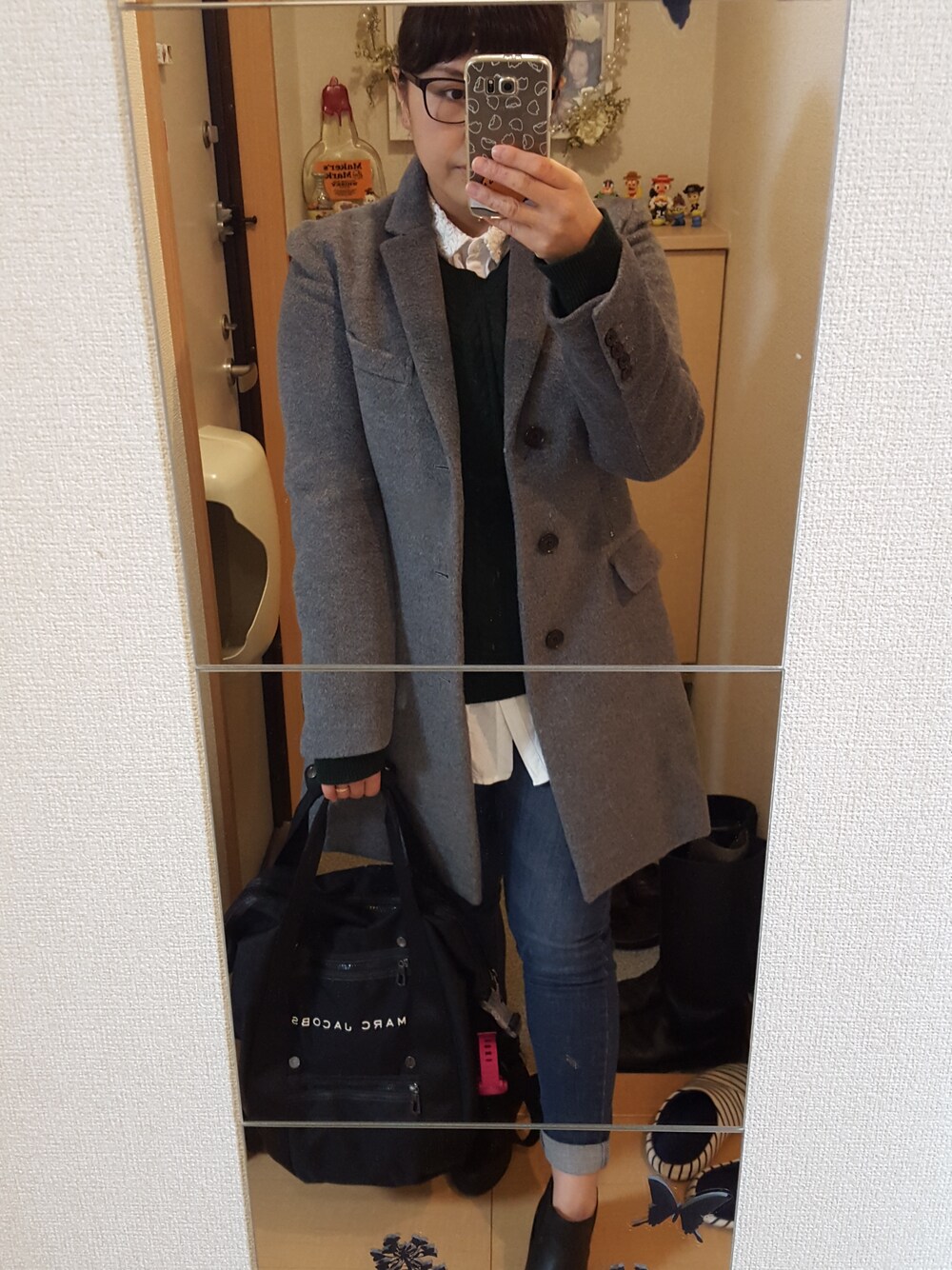 新しいコーディネートに挑戦したいけど いつもおんなじようなかっこになっちゃうな〜 今日は寒いのでマフラーも持っていこう〜♪