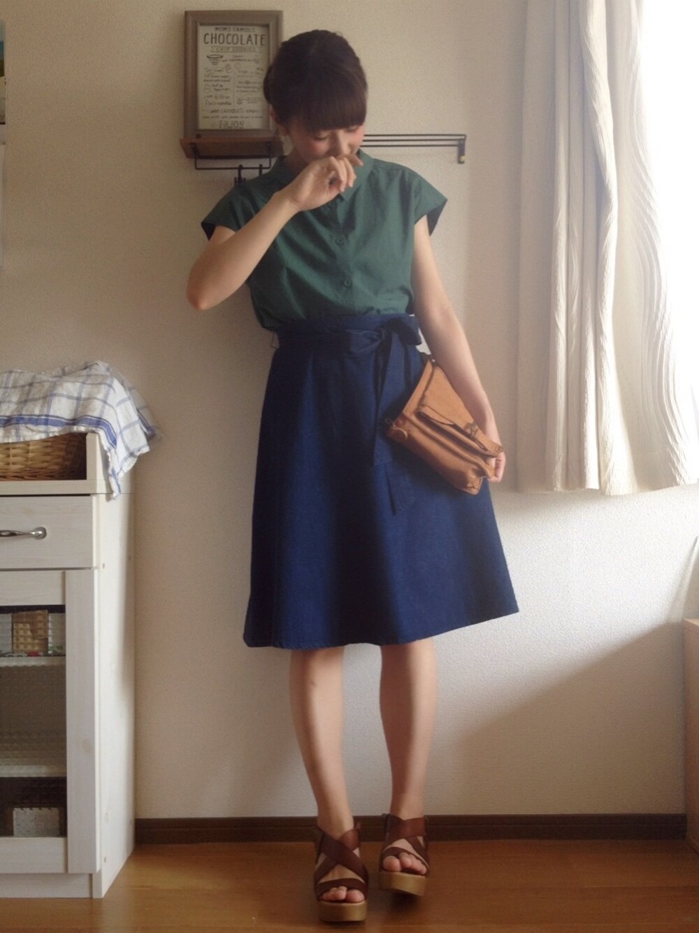 キャリーヌのグリーンは なに合わせてもすてきになる(ˊᵕ͙ૣᴗᵕ͙ૣˋ) 厚底なのに裸足みたいに軽いサンダルで たくさん歩きました. バッグ:NICE CLAUP