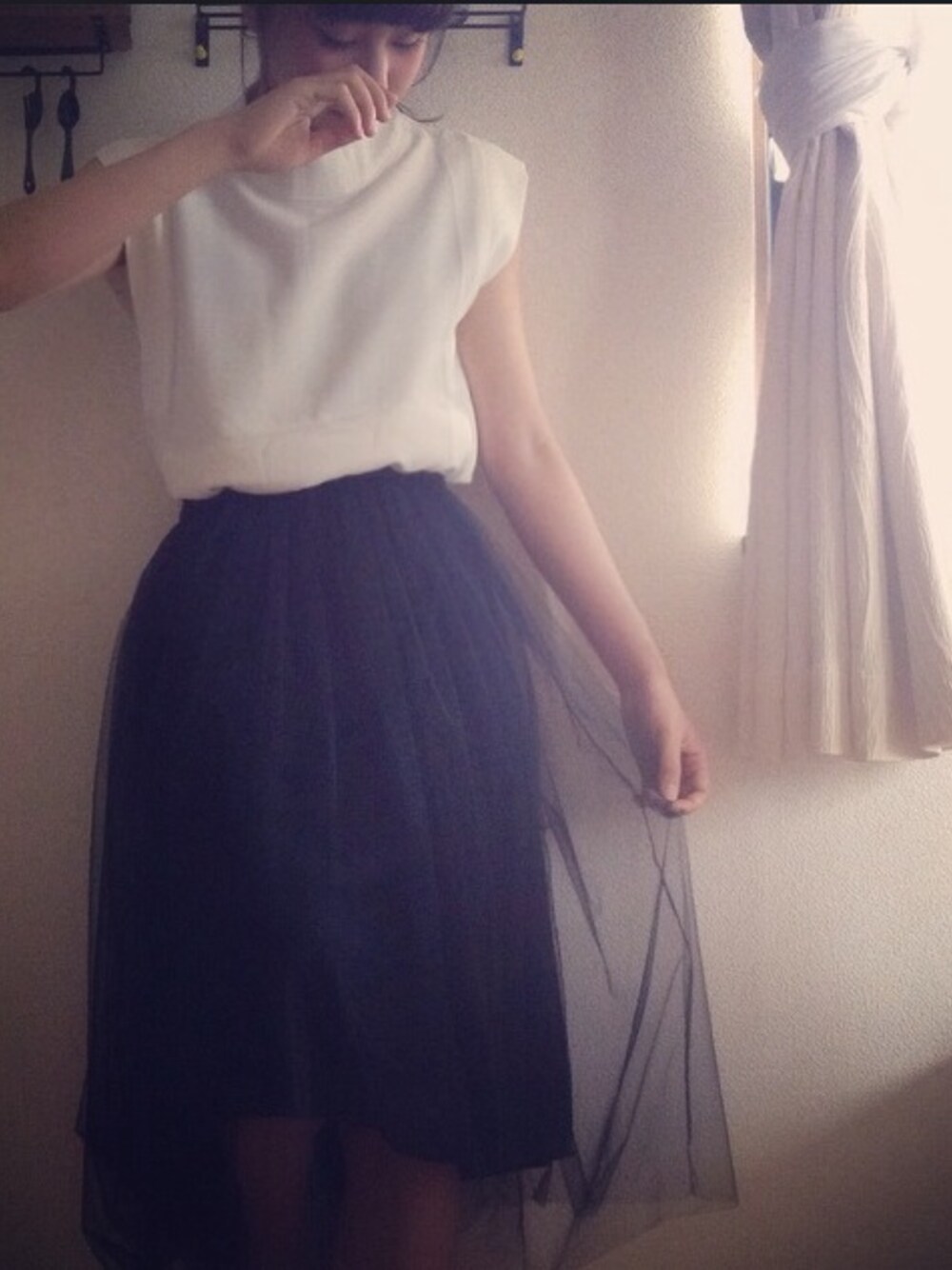 雨で写真が暗くて色加工(◞‸◟) バレリーナのチュチュみたいな、 とってもきれいなチュールを 真っ白なノースリーブで凛と. くつはうしろのリボンが愛らしい 赤いエスパドリューを履きました. チュール:etude