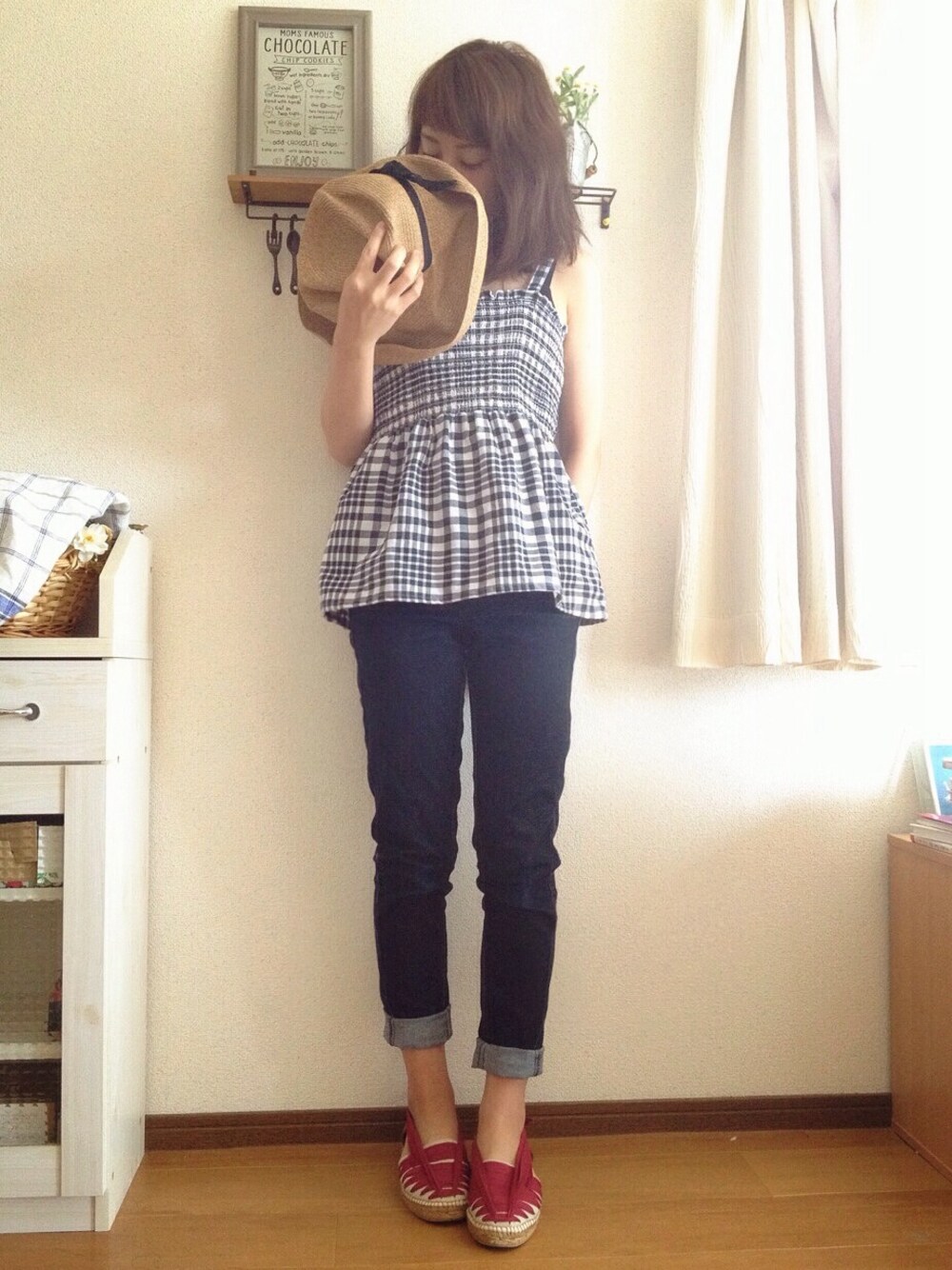 usedのギンガムチェックのキャミは 1枚で着たいお気に入り. インナーなしでも髪長いと肩がかくれて いいかんじです(*´˘`*) 赤のエスパドリーユで女の子らしく. キャミソール:used 帽子:マチュア