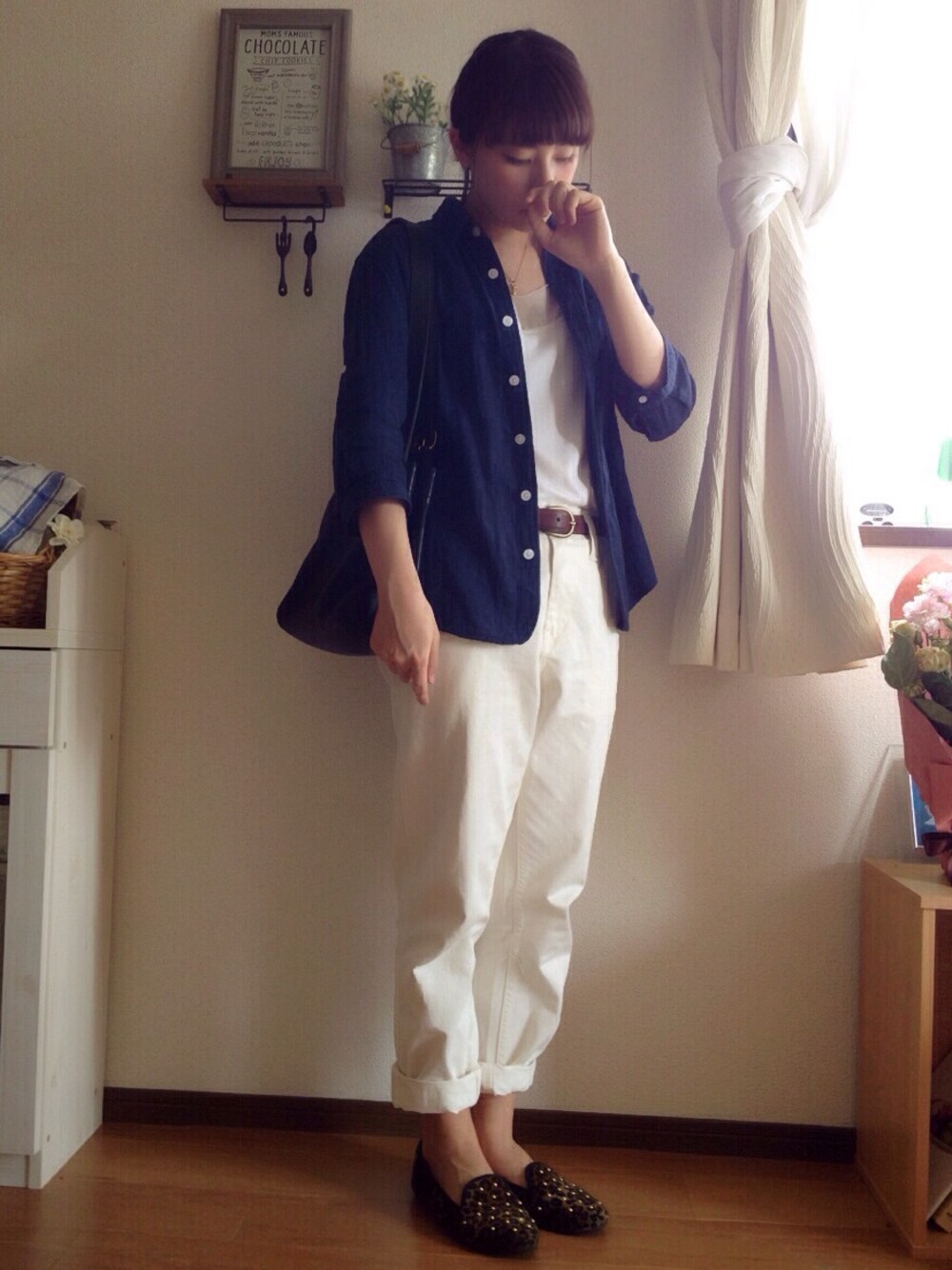 しろしろ×紺⚑ インをぴたっと着て 黒のレザーでしめて 髪の毛もっとゆるくまとめて大人ぽく( ˆ࿀ˆ )♩ シャツ:おさがり Tシャツ:アーバンリサーチ バッグ:used 靴:GU