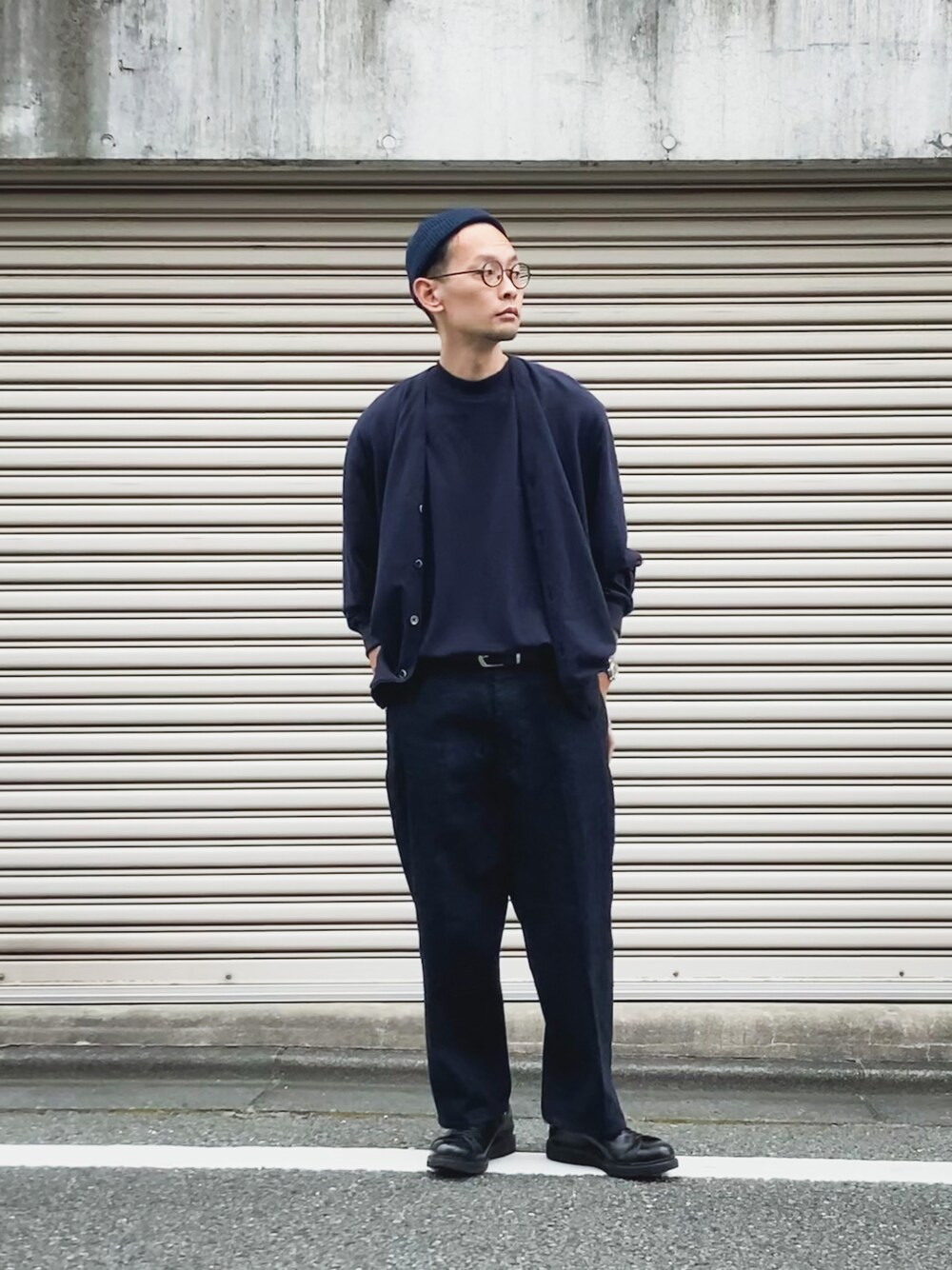 サイベーシック×レショップの鹿子カーディガンをセットアップで。 全身をネイビーワントーンでまとめました。 今年はアンサンブルの気分。