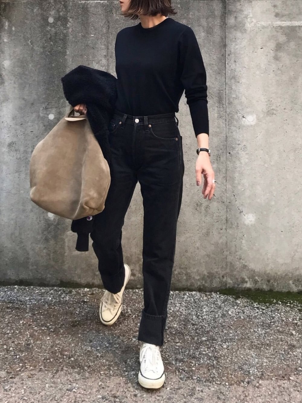 クルーネックニットプルオーバーの黒を着用しました。 これは先月の22日に注文して、つい最近やっと届きました。 前回の白は何もサイズをいじらず最適サイズのまま注文したので、すぐに配送されましたが、 やはりオーダーするとそれなりの時間がかかります。 今回は肩幅だけ最適サイズでそれ以外は、 胸囲 (最適サイズから)+4センチ 着丈 +6センチ 袖丈 +10センチ でオーダーしました。 これは、、、めちゃくちゃいいです。 見た目も高見えだし、おススメです。 身頃も少しゆったりしてて、何より袖を10センチ長くした事で、 ぐっと上にたくし上げた時のくしゃっとした感じもちょうど良くなりました。 オーダーする際、是非参考にしてみて下さい。