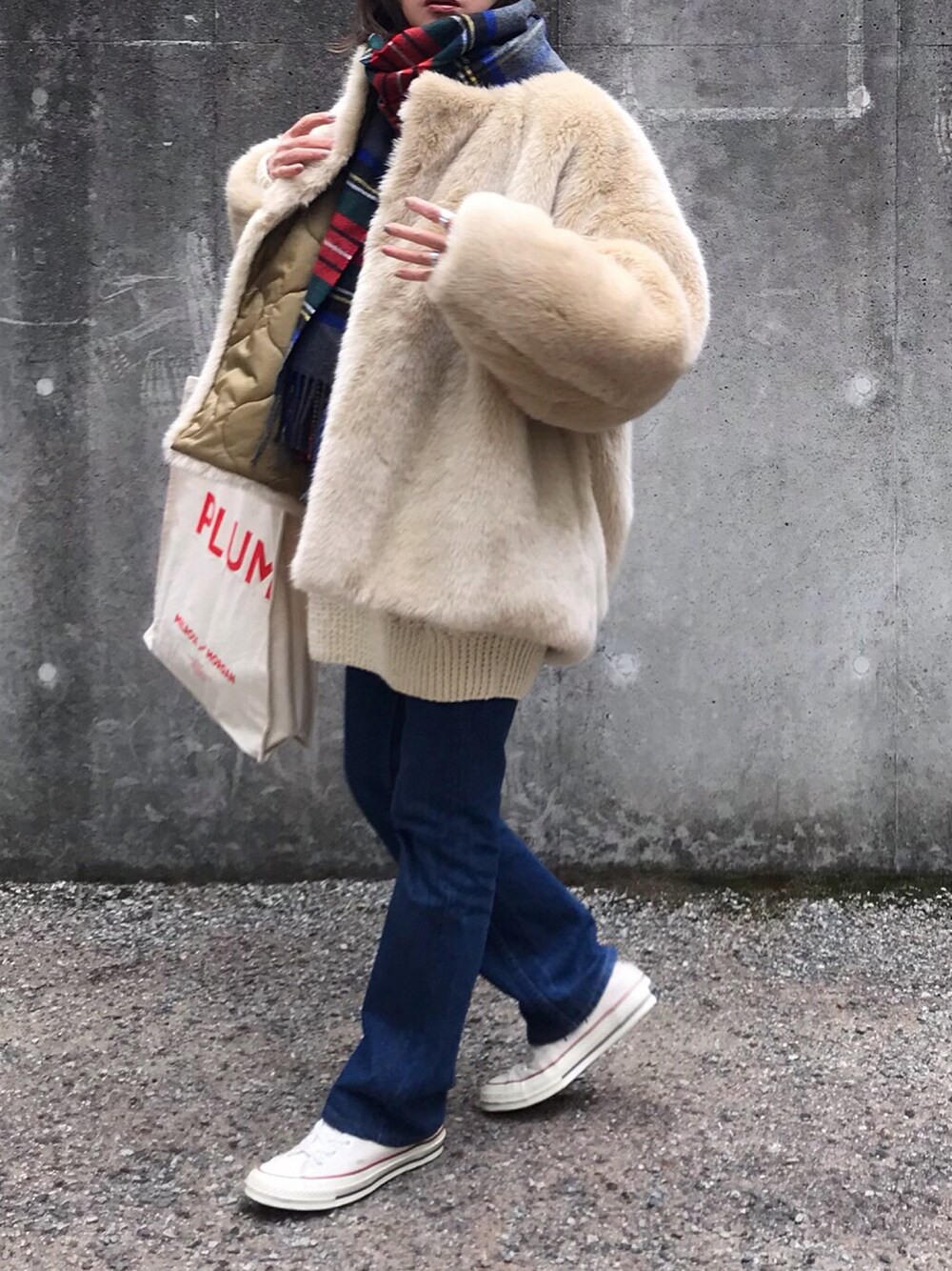 あさひのストール/ショール「BY JOHNSTONES タータンチェック カシミヤストール」を使ったコーディネート