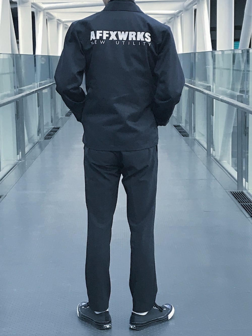 UmEのテーラードジャケット「AFFIX Logo-Print Cotton-Blend Twill Jacket」を使ったコーディネート
