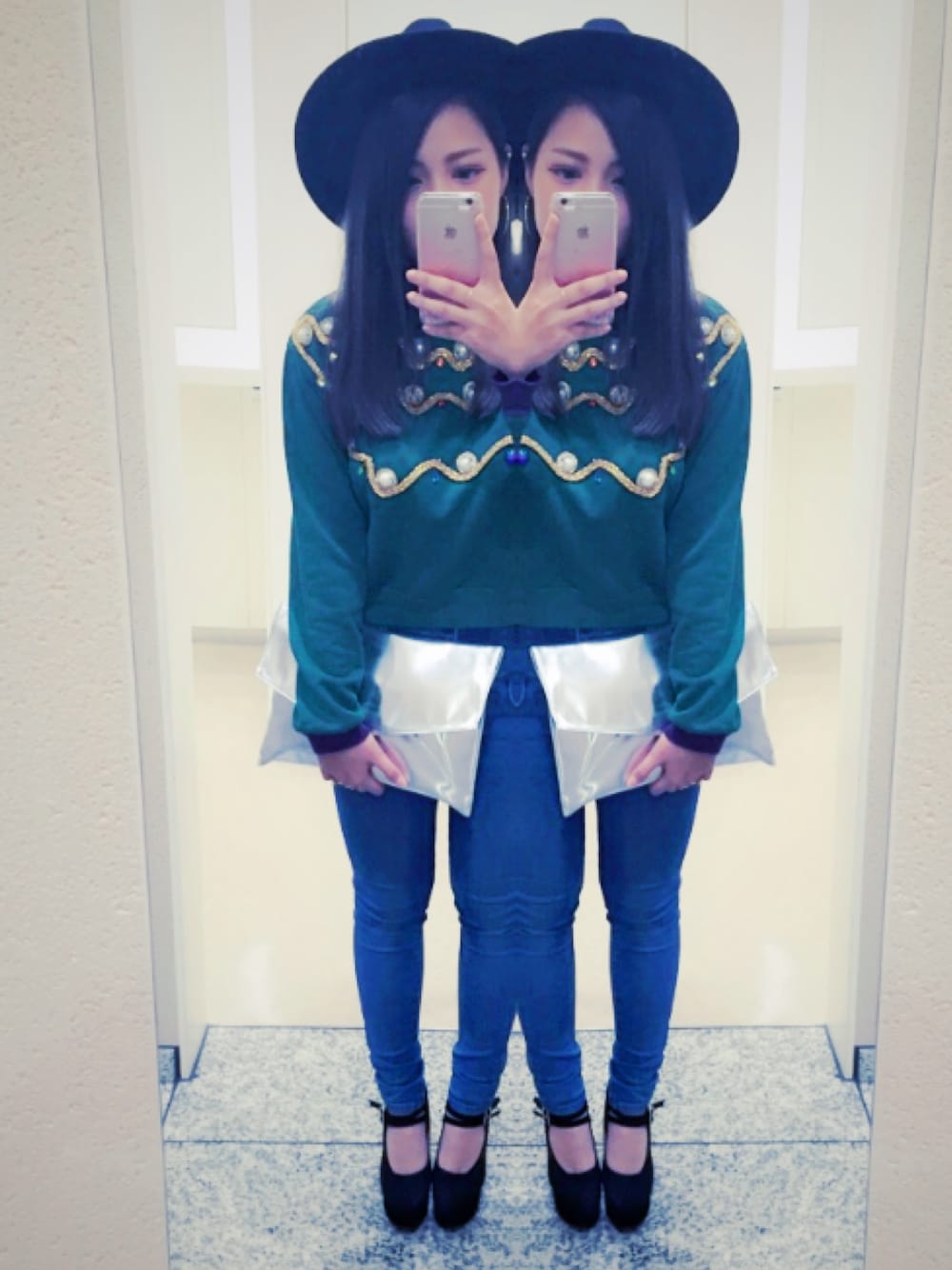 80s'テイストに黒のハットで今風に。 キラキラビジュートップスがポイントです。