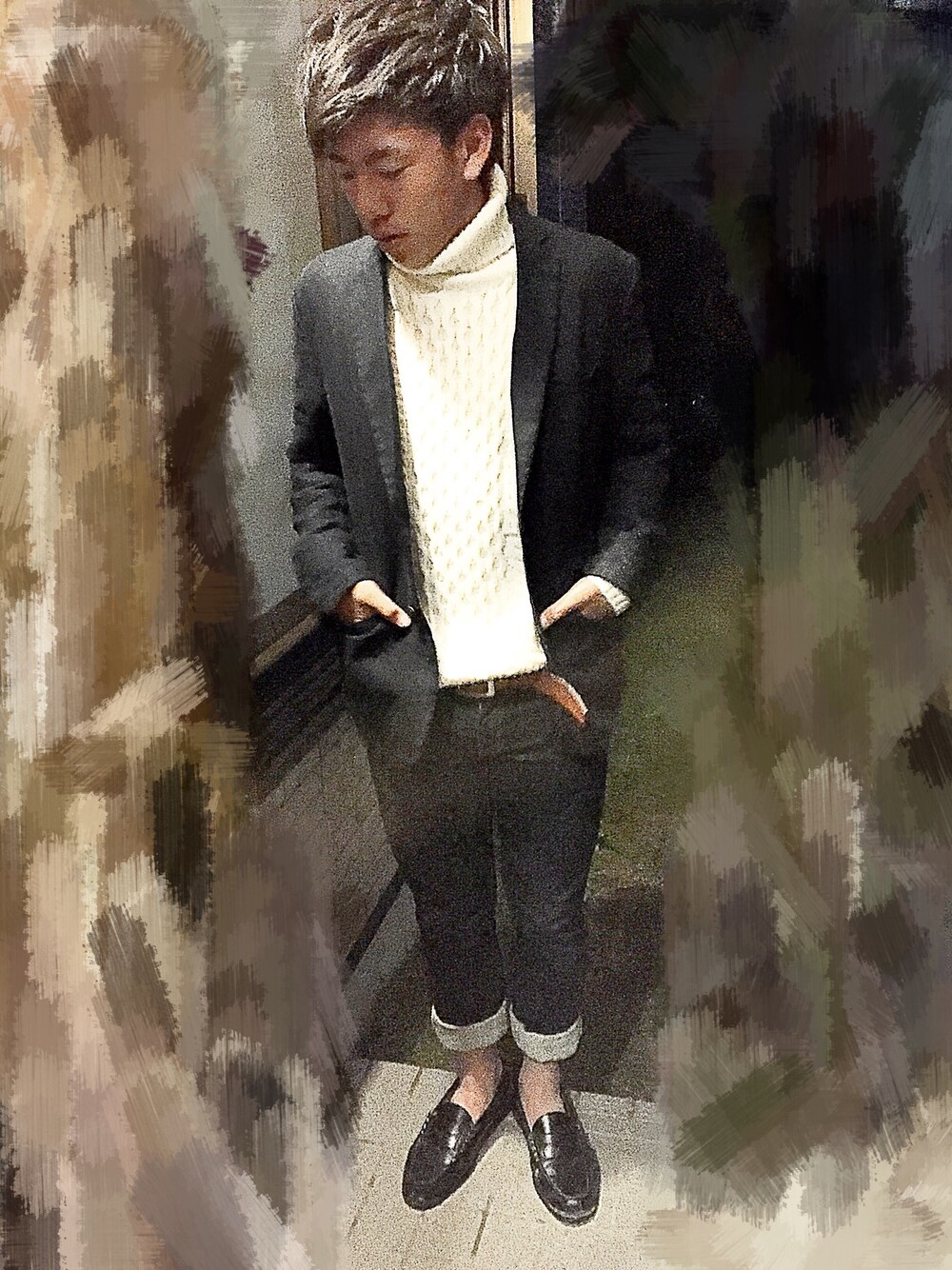 ハイネック初めての試みです! こんな感じでいいんですかね?(笑) やっぱキレイめ難しいなー💀 今のローファーの皮の感じ最高💥 帰ったら手入れ、手入れ💦 でも雨止んでーー🙏🙏 ローファーだったら長めのソックス履いた方がいいですかね? アドバイスお願いします!!