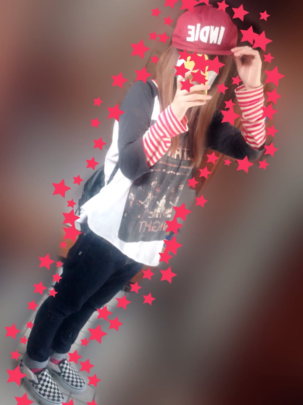 ピンクと黄色の珍しいボーダーのワッフルロンTがポイント🎵☺️ ボーダーって何か着てると落ち着く柄です❗️ 赤のキャップって何で、こんなに可愛いのだろうか笑😍💓💓
